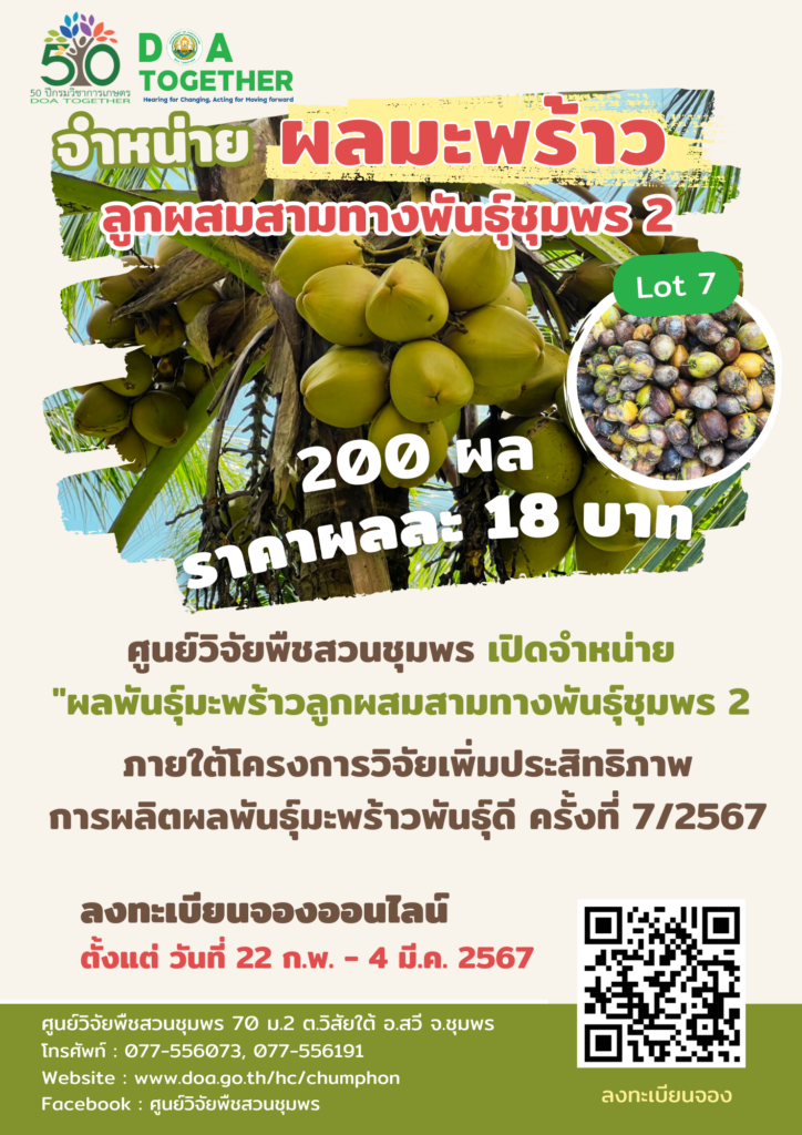 จำหน่ายผลมะพร้าวลูกผสมสามทางพันธุ์ชุมพร 2 ครั้งที่ 7/2567