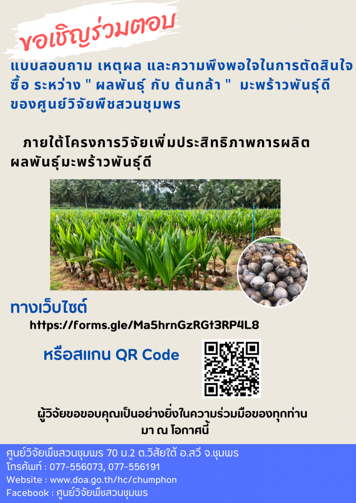 . ขอเชิญร่วมตอบแบบสอบถาม เหตุผล และความพึงพอใจในการตัดสินใจซื้อ ระหว่าง ” ผลพันธุ์ กับ ต้นกล้า ” มะพร้าวพันธุ์ดีของศูนย์วิจัยพืชสวนชุมพรภายใต้โครงการวิจัยเพิ่มประสิทธิภาพการผลิตผลพันธุ์มะพร้าวพันธุ์ดีลิงค์แบบสอบถามคลิก : https://forms.gle/C4dheG6yKUMtEN2k6 ผู้วิจัยขอขอบคุณเป็นอย่างยิ่งในความร่วมมือของทุกท่าน มา ณ โอกาศนี้