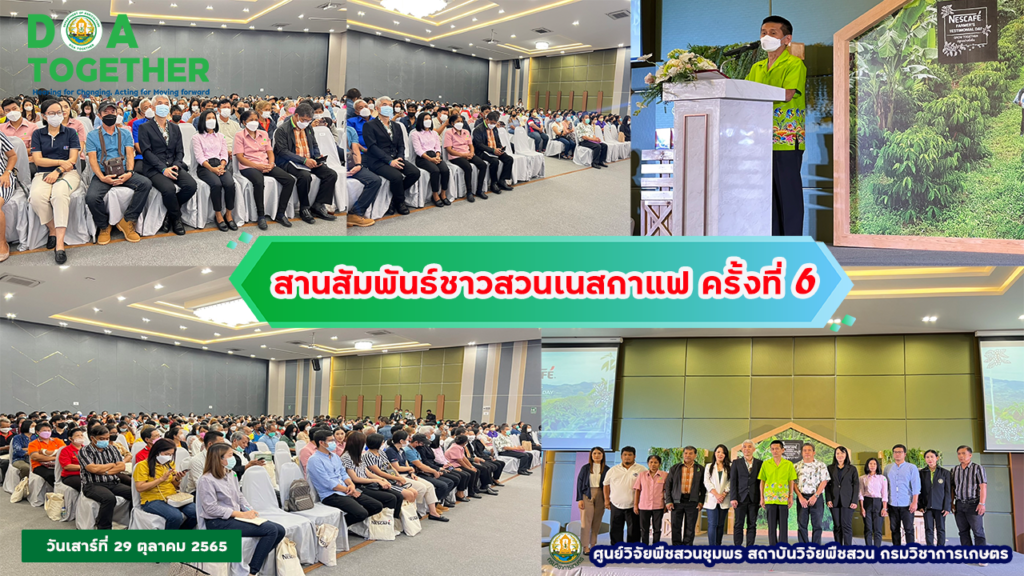 วันเสาร์ ที่ 29 ตุลาคม 2565 เวลา 09.30 น. นางสาวทิพยา ไกรทอง ผู้อำนวยการศูนย์วิจัยพืชสวนชุมพร พร้อมด้วย นางสาวดารากร เผ่าชู นักวิชาการเกษตรชำนาญการ และนางสาวอรทัย ธนัญชัย นักวิชาการเกษตรปฏิบัติการ ร่วมงาน “สานสัมพันธ์ชาวสวนเนสกาแฟ