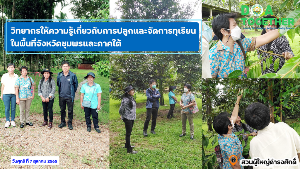 วันศุกร์ ที่ 7 ตุลาคม 2565 เวลา 9.00 น. ผู้อำนวยการศูนย์วิจัยพืชสวนชุมพร มอบหมายให้ นางสาวณิชชา แหลมเพ็ชร์ ผู้อำนวยการกลุ่มวิจัย เป็นวิทยากรให้ความรู้เกี่ยวกับการปลูกและจัดการทุเรียนในพื้นที่จังหวัดชุมพรและภาคใต้ แก่ คณะศูนย์เครือข่ายงานวิเคราะห์ วิจัยและฝึกอบรมการเปลี่ยนแปลงของโลกแห่งภูมิภาคเอเชียตะวันออกเฉียงใต้ กทม. ณ สวนผู้ใหญ่ดำรงศักดิ์