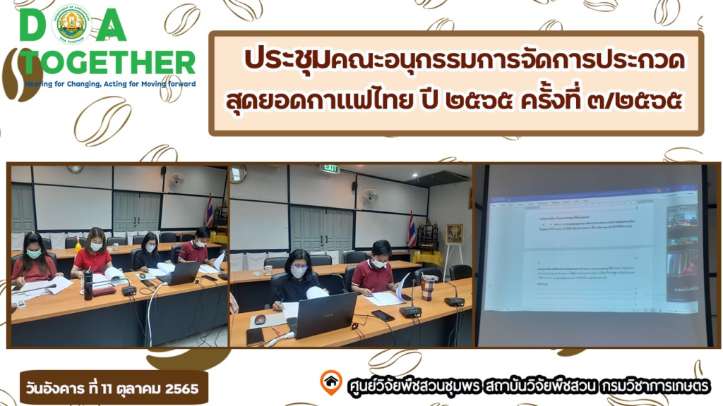 วันที่ 11 ตุลาคม 2565 นางสาวทิพยา ไกรทอง ผู้อำนวยการศูนย์วิจัยพืชสวนชุมพร และนักวิชาการที่เกี่ยวข้อง ร่วมประชุม คณะอนุกรรมการโครงการประกวดสุดยอดกาแฟไทย ปี 2565 ครั้งที่ 3/2565 ผ่านระบบออนไลน์ (Zoom meeting) ณ