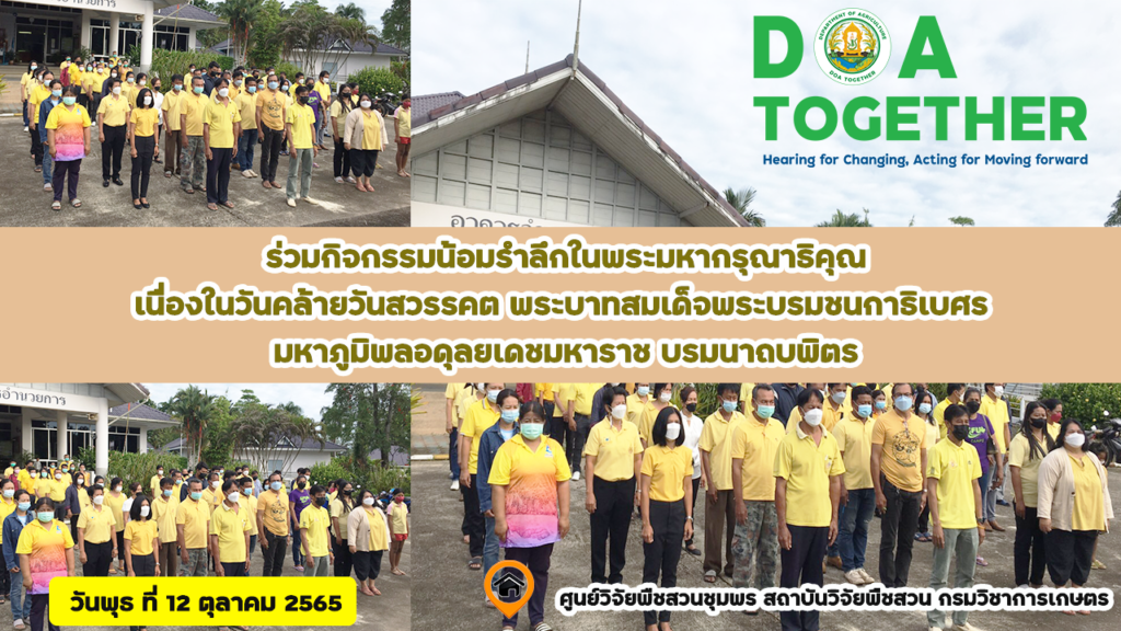 วันพุธ ที่ 12 ตุลาคม 2565 ศูนย์วิจัยพืชสวนชุมพร นำโดย นางสาวทิพยา ไกรทอง ผู้อำนวยการศูนย์ฯ พร้อมด้วย ข้าราชการ พนักงาน ศูนย์วิจัยพืชสวนชุมพร ร่วมกิจกรรม น้อมรำลึกในพระมหากรุณาธิคุณ เนื่องในวันคล้ายวันสวรรคตพระบาทสมเด็จพระบรมชนกาธิเบศร มหาภูมิพลอดุลยเดชมหาราชบรมนาถบพิตร 13 ตุลาคม