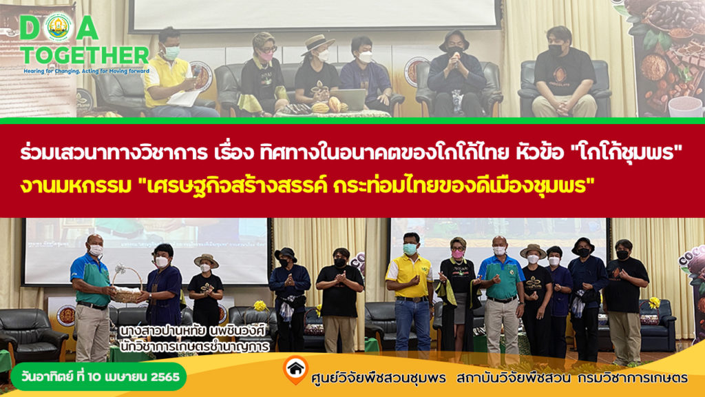 วันอาทิตย์ ที่ 10 เมษายน 2565 นางสาวปานหทัย นพชินวงศ์ นักวิชาการเกษตรชำนาญการ ได้รับเชิญเป็นวิทยากรเข้าร่วมการเสวนาทางวิชาการ เรื่อง “ทิศทางในอนาคตของโกโก้ไทย” หัวข้อเสวนาเรื่อง “โกโก้ชุมพร” (ห้องประชุมราชพฤกษ์) ในงานมหกรรม “เศรษฐกิจสร้างสรรค์ กระท่อมไทยของดีเมืองชุมพร” ระหว่างวันที่ 8