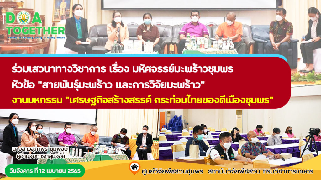 วันอังคาร ที่ 12 เมษายน 2565 นางสาวสุภาพร ชุมพงษ์ ผู้อำนวยการกลุ่มวิจัย ได้รับเชิญเป็นวิทยากรเข้าร่วมการเสวนาทางวิชาการ เรื่อง “มหัศจรรย์มะพร้าวชุมพร” หัวข้อเสวนาเรื่อง “สายพันธุ์มะพร้าว และการวิจัยมะพร้าว” (ห้องประชุมราชพฤกษ์) ในงานมหกรรม “เศรษฐกิจสร้างสรรค์ กระท่อมไทยของดีเมืองชุมพร” ระหว่างวันที่