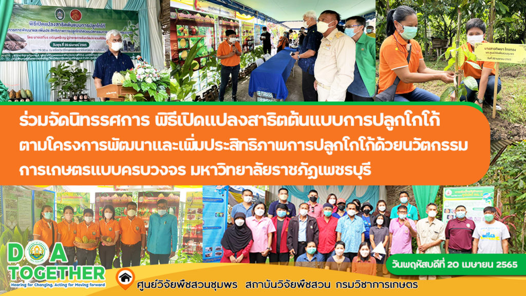 วันพฤหัสบดี ที่ 20 เมษายน 2565 เวลา 9.30 น. นางสาวทิพยา ไกรทอง ผู้อำนวยการศูนย์วิจัยพืชสวนชุมพร และนักวิชาการที่เกี่ยวข้อง ร่วมจัดนิทรรศการ การปลูกโกโก้ โกโก้พันธุ์รับรอง กระบวนการแปรรูปโกโก้ ผลิตภัณฑ์จากโกโก้ และมะพร้าวพันธุ์รับรอง