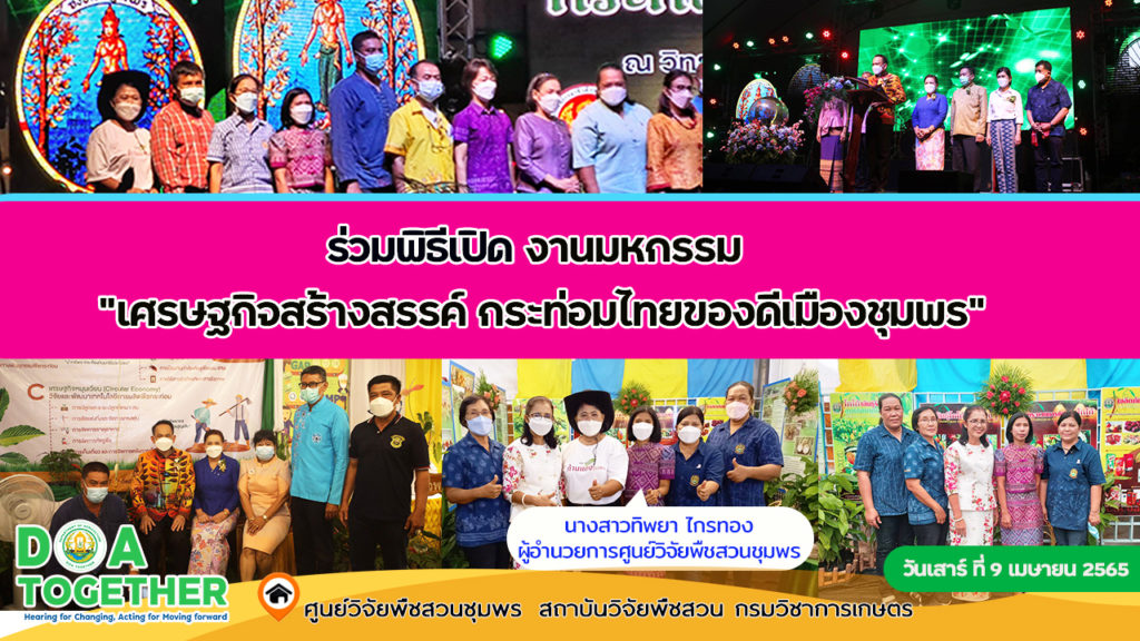 วันอาทิตย์ ที่ 9 เมษายน 2565 นางสาวทิพยา ไกรทอง ผู้อำนวยการศูนย์วิจัยพืชสวนชุมพร พร้อมด้วยนางสาวสุภาพร ชุมพงษ์ ผู้อำนวยการกลุ่มวิจัย และเจ้าหน้าที่ศูนย์ฯ ร่วมพิธีเปิด และจัดแสดงนิทรรศการ มะพร้าวโกโก้ และกาแฟโรบัสตา งานมหกรรม “เศรษฐกิจสร้างสรรค์ กระท่อมไทยของดีเมืองชุมพร”