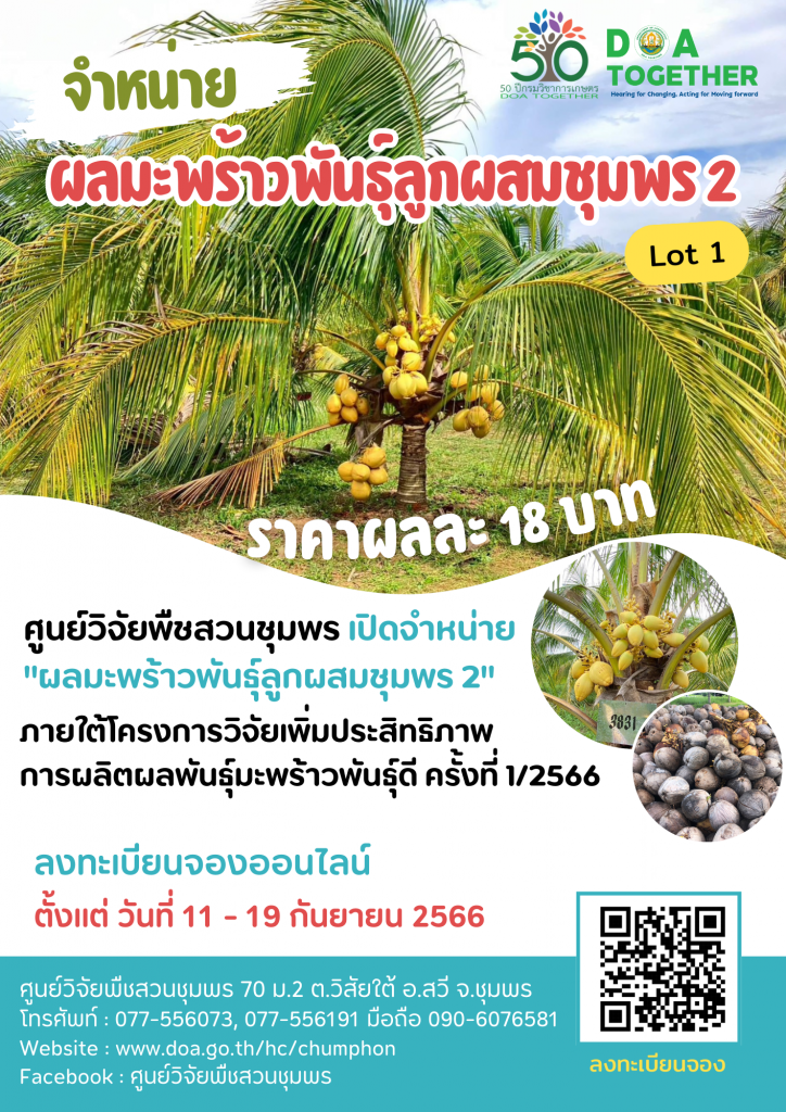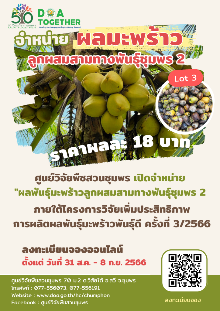 ด้วยศูนย์วิจัยพืชสวนชุมพร มีความประสงค์ จำหน่ายผลมะพร้าวพันธุ์ลูกผสมชุมพร 2 เพื่อสร้างเป็นแปลงเพาะชำสำหรับผลิตต้นกล้าภายใต้การควบคุมมาตรฐานกรมวิชาการเกษตรว่าด้วยการควบคุมคุณภาพผลพันธุ์มะพร้าว สำหรับจำหน่ายเป็นต้นกล้าคุณภาพ “ภายใต้โครงการวิจัยเพิ่มประสิทธิภาพ การผลิตผลพันธุ์มะพร้าวพันธุ์ดี” ครั้งที่ 1/2566 จำนวน 3,000 ผล ราคาผลละ 18 บาท โดยจะเปิดจำหน่ายในวันที่ 11 – 19 […]