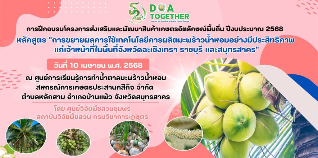 วันอังคารที่ 6 พฤษภาคม 2568 เวลา 08.00 น. – 17.00 น. นางสาวหยกทิพย์ สุดารีย์ นักวิชาการเกษตรชำนาญการ และนางสาวพันธ์ทิพย์ มีสถิตย์ นักวิชาการเกษตรปฏิบัติการ ร่วมเป็นวิทยากร การฝึกอบรม โครงการขยายผลการสร้างแปลงต้นแบบแม่พันธุ์และการยกระดับมาตรฐานไปสู่การตรวจรับรองพันธุ์มะพร้าวน้ำหอม […]