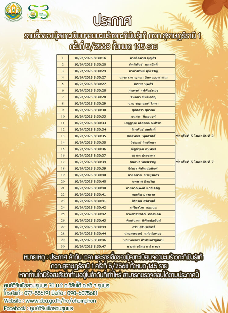 ประกาศรายชื่อผู้ลงทะเบียนจองมะพร้าวกะทิพันธุ์แท้ กวก.สุราษฎร์ธานี 1 ครั้งที่ 5/2568 ทั้งหมด 145 ราย