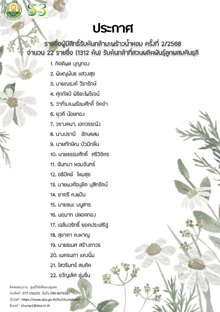 ประกาศรายชื่อผู้มีสิทธิ์รับต้นกล้ามะพร้าวน้ำหอม ครั้งที่ 2/2568 จำนวน 22 รายชื่อ (1312 ต้น) รับต้นกล้าที่คันธุลี