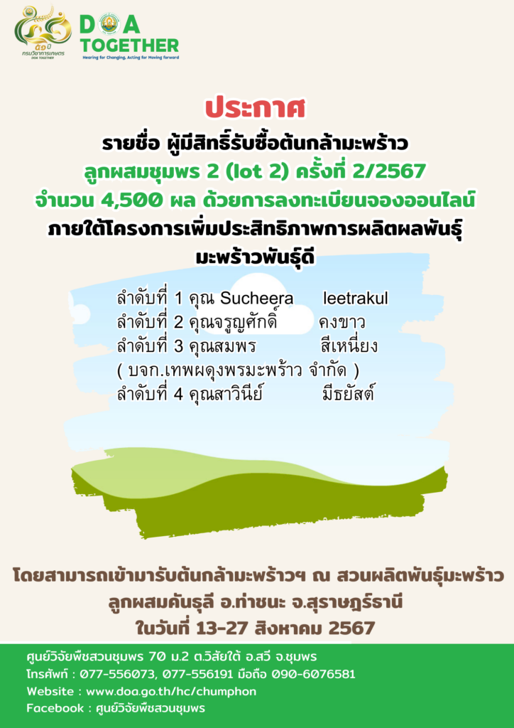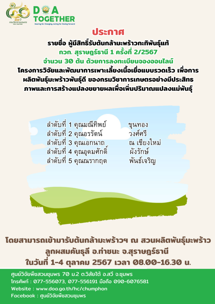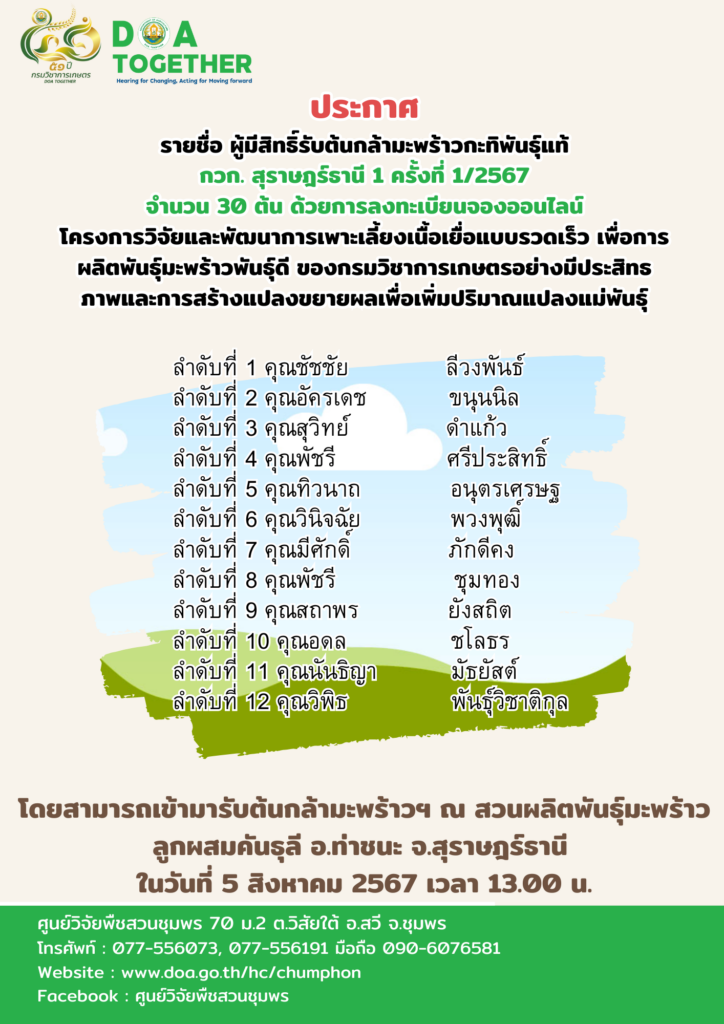 ประกาศ รายชื่อ ผู้มีสิทธิ์รับต้นกล้ามะพร้าวกะทิพันธุ์แท้ กวก. สุราษฎร์ธานี 1 ครั้งที่ 2/2567 จำนวน 30 ต้น ด้วยการลงทะเบียนจองออนไลน์ โครงการวิจัยและพัฒนาการเพาะเลี้ยงเนื้อเยื่อแบบรวดเร็ว เพื่อการผลิตพันธุ์มะพร้าวพันธุ์ดี ของกรมวิชาการเกษตรอย่างมีประสิทธภาพและการสร้างแปลงขยายผลเพื่อเพิ่มปริมาณแปลงแม่พันธุ์