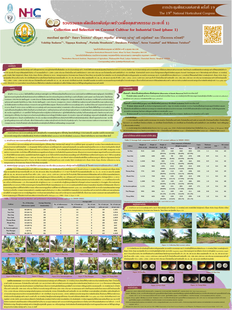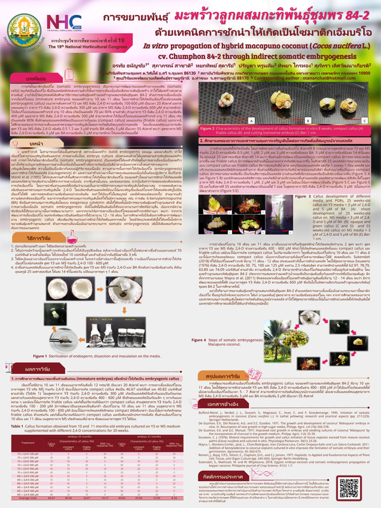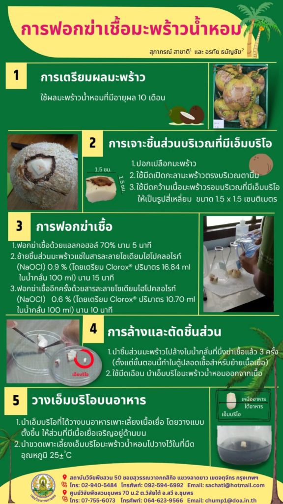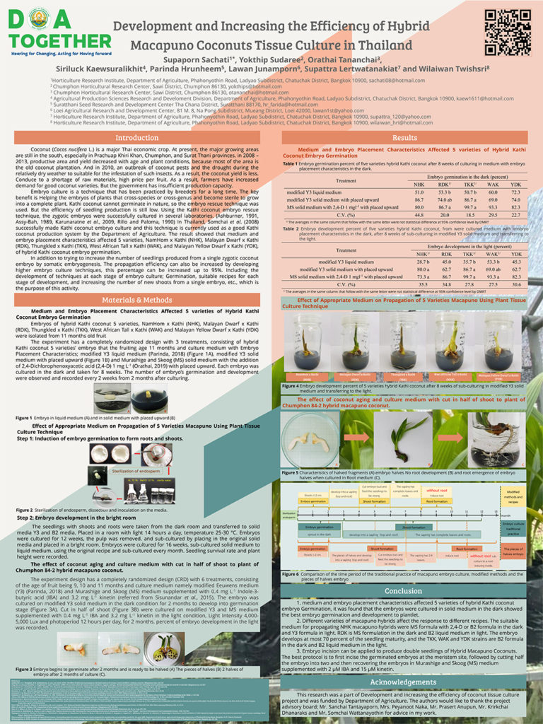 โปสเตอร์/อินโฟกราฟฟิกส์Development and Increasing the Efficiency of Hybrid Macapuno Coconuts Tissue Culture in Thailand admitc / 2 November 2565