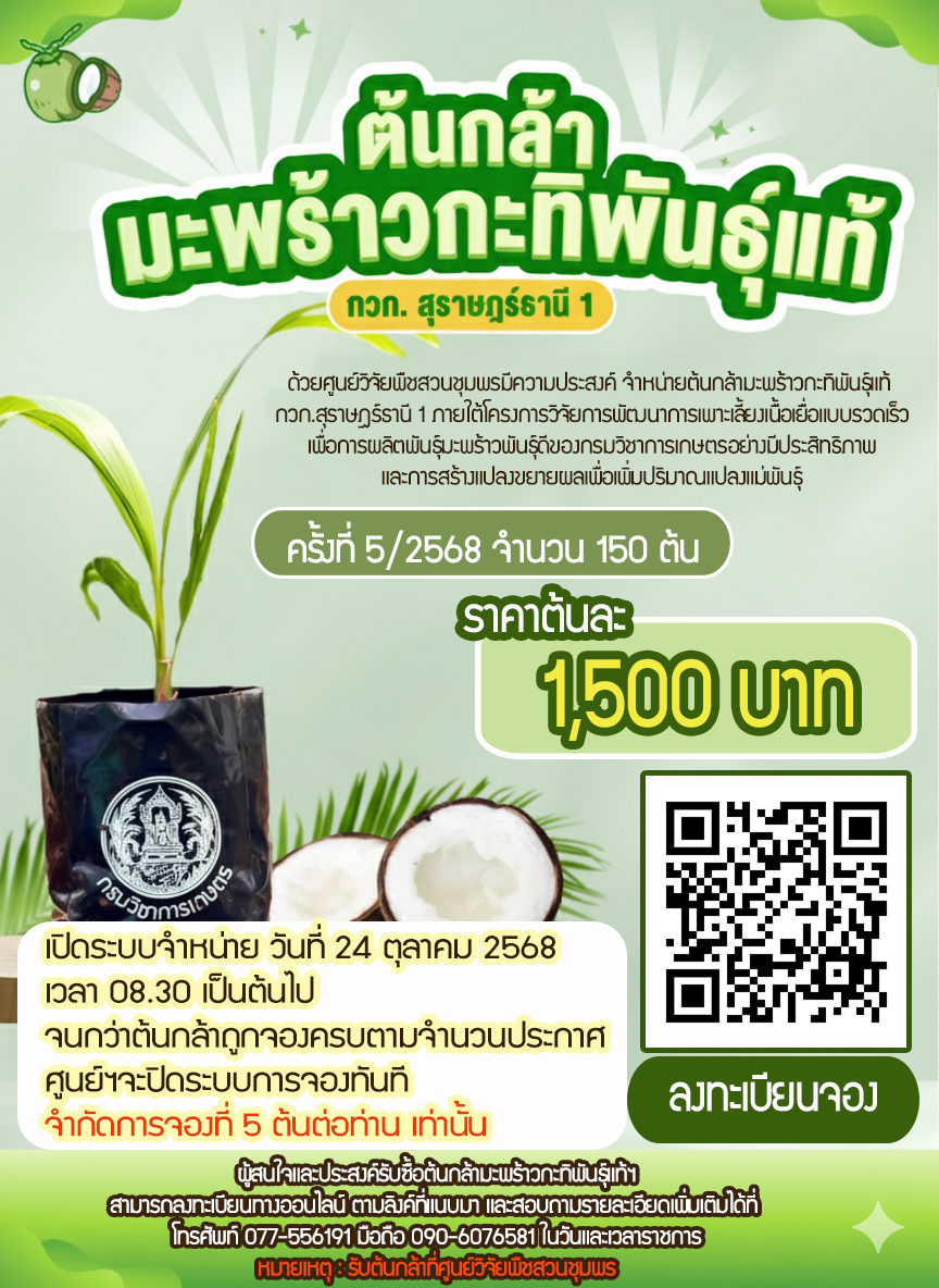 ด้วยศูนย์วิจัยพืชสวนชุมพรมีความประสงค์ : เปิดจำหน่ายต้นกล้ามะพร้าวกะทิพันธุ์แท้ กวก.สุราษฎร์ธานี 1 ภายใต้โครงการวิจัยการพัฒนาการเพาะเลี้ยงเนื้อเยื่อแบบรวดเร็วเพื่อการผลิตพันธุ์มะพร้าวพันธุ์ดี ของกรมวิชาการเกษตรอย่างมีประสิทธิภาพ และการส้รางแปลงขยายผลเพื่อเพิ่มปริมาณแปลงแม่พันธุ์ ครั้งที่ 5/2568 ในวันศุกร์ที่ 24 ตุลาคม 2568 เวลา 8:30 น.