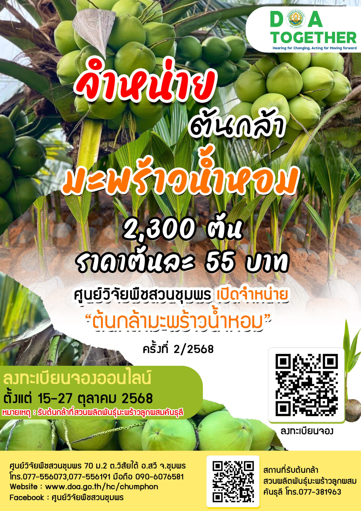 ด้วยศูนย์วิจัยพืชสวนชุมพร มีความประสงค์ จำหน่ายต้นกล้ามะพร้าวน้ำหอม ครั้งที่ 2/2568 จำนวน 2,300 ต้น ราคาต้นละ 55 บาท