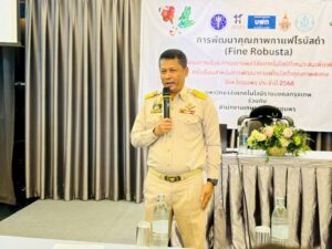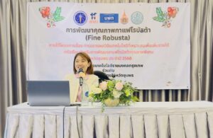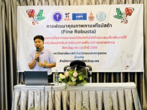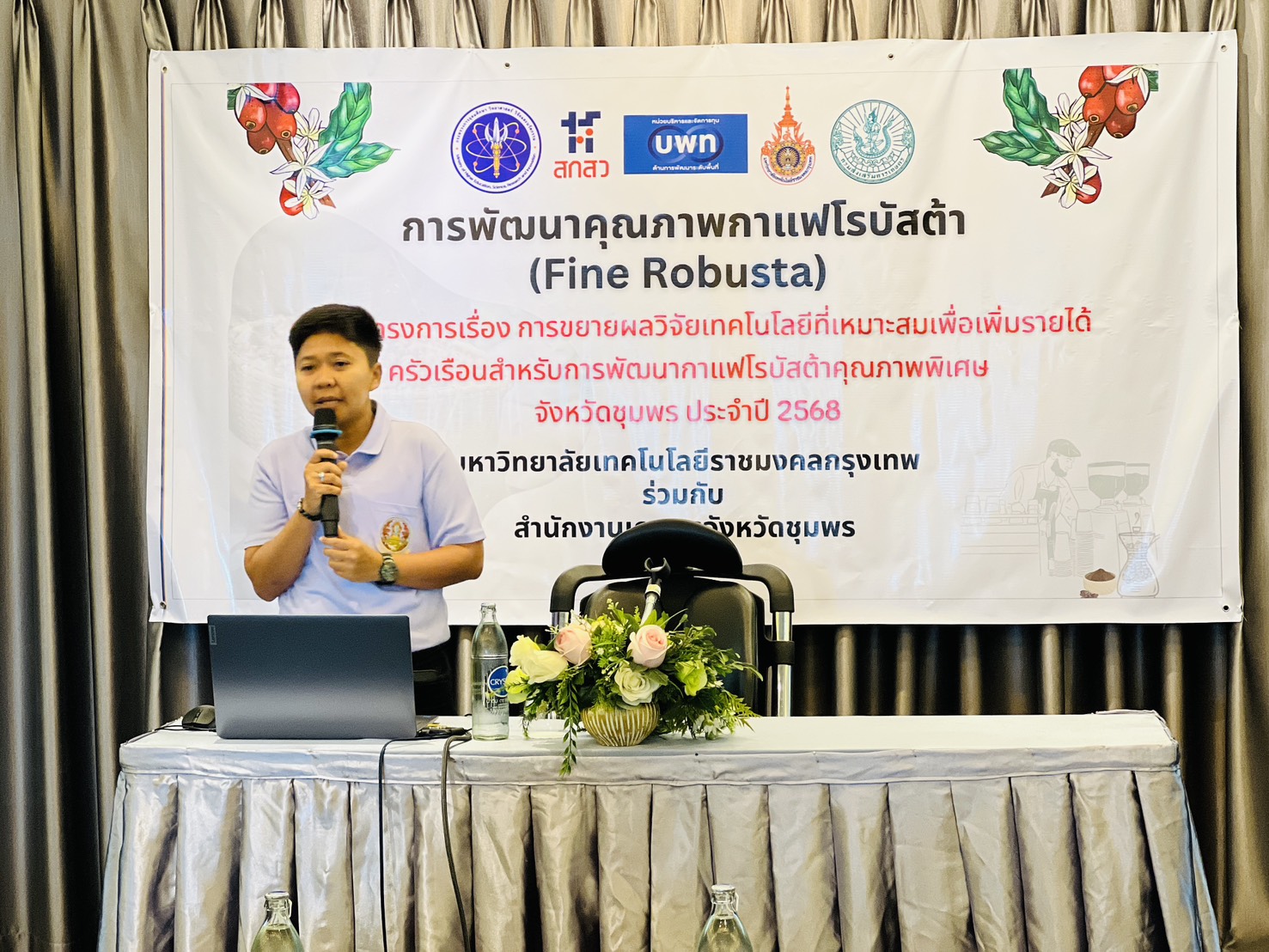 วันที่ 20-21 ตุลาคม 2568 นางสาวทิพยา ไกรทอง ผู้อำนวยการศูนย์วิจัยพืชสวนชุมพร มอบหมายให้ นางสาวดารากร เผ่าชู นักวิชาการเกษตรชำนาญการ และ นางสาวอรทัย ธนัญชัย นักวิชาการเกษตรชำนาญการ ร่วมเป็นวิทยากร ให้ความรู้ เรื่อง เทคโนโลยีการผลิตกาแฟโรบัสตา และ นายธนวัฒน์ แซ่หลิน Q Robusta grader ให้ความรู้ เรื่อง การพัฒนาคุณภาพกาแฟโรบัสตา “Fine Robusta” กิจกรรมอบรมการพัฒนาคุณภาพกาแฟโรบัสตา (Fine Robusta) ครั้งที่ 1 ภายใต้โครงการ การขยายผลวิจัยเทคโนโลยีที่เหมาะสมเพื่อเพิ่มรายได้ครัวเรือนสำหรับการพัฒนากาแฟโรบัสตาคุณภาพพิเศษ ปี 2568 โดยมี นายสุบรรณ์ รักษ์ทอง เกษตรจังหวัดชุมพร เป็นประธานเปิดงาน ณ โรงแรม ลอฟมาเนีย อำเภอเมืองชุมพร จังหวัดชุมพร