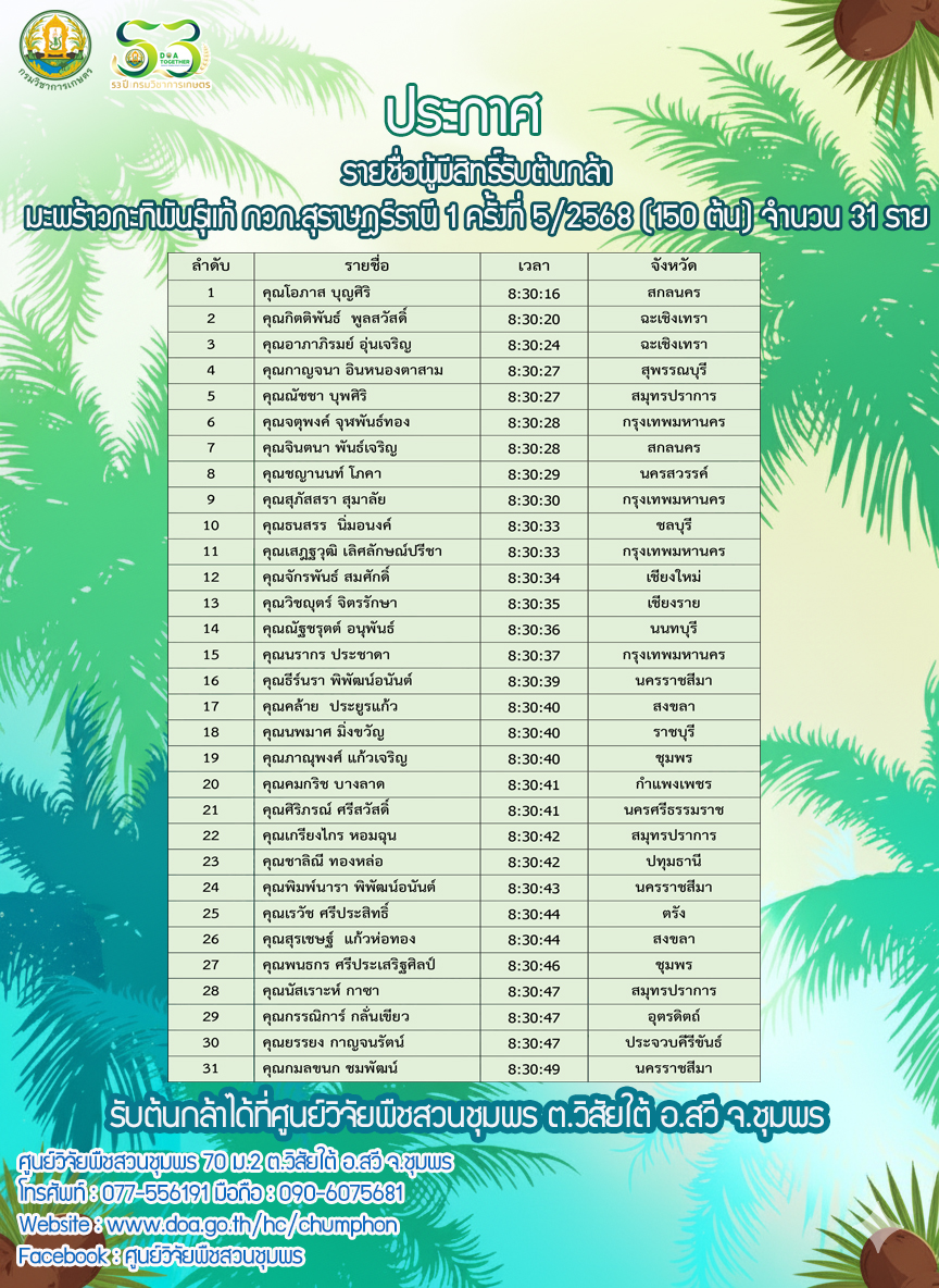 ประกาศรายชื่อผู้มีสิทธิ์รับต้นกล้ามะพร้าวกะทิพันธุ์แท้ กวก.สุราษฎร์ธานี 1 ครั้งที่ 5/2568 (150 ต้น) จำนวน 31 รายBy Pornnapat Chrc / 27 October 2568 ประกาศรายชื่อผู้มีสิทธิ์รับต้นกล้ามะพร้าวกะทิพันธุ์แท้ กวก.สุราษฎร์ธานี 1 ครั้งที่ 5/2568 (150 ต้น) จำนวน 31 ราย Post Views: 22 FacebookFacebookXTwitterLINELine