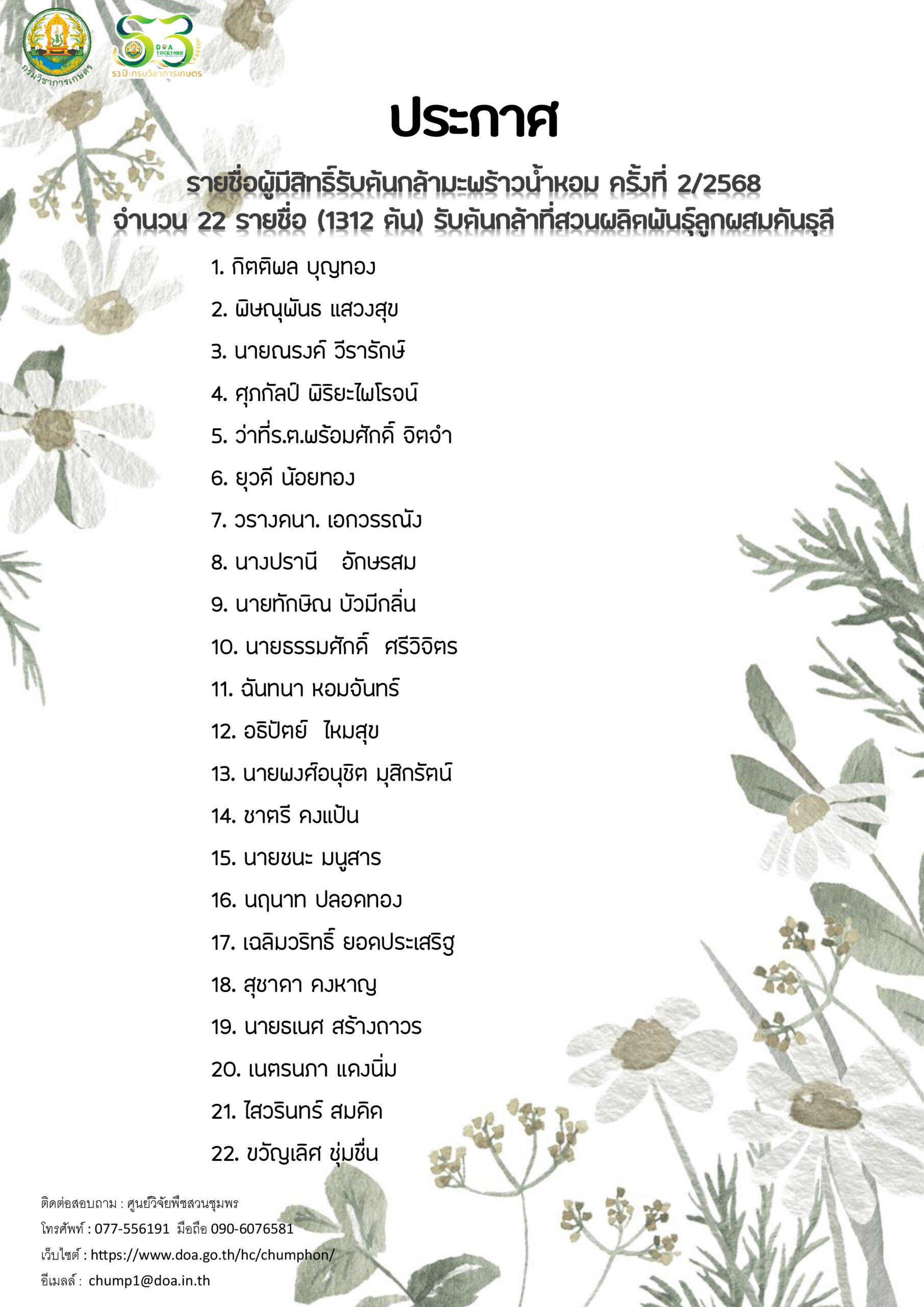 ประกาศรายชื่อผู้มีสิทธิ์รับต้นกล้ามะพร้าวน้ำหอม ครั้งที่ 2/2568 จำนวน 22 รายชื่อ (1312 ต้น) รับต้นกล้าที่คันธุลีBy Pornnapat Chrc / 31 October 2568 ประกาศรายชื่อผู้มีสิทธิ์รับต้นกล้ามะพร้าวน้ำหอม ครั้งที่ 2/2568 จำนวน 22 รายชื่อ (1312 ต้น) รับต้นกล้าที่คันธุลี Post Views: 14 FacebookFacebookXTwitterLINELine