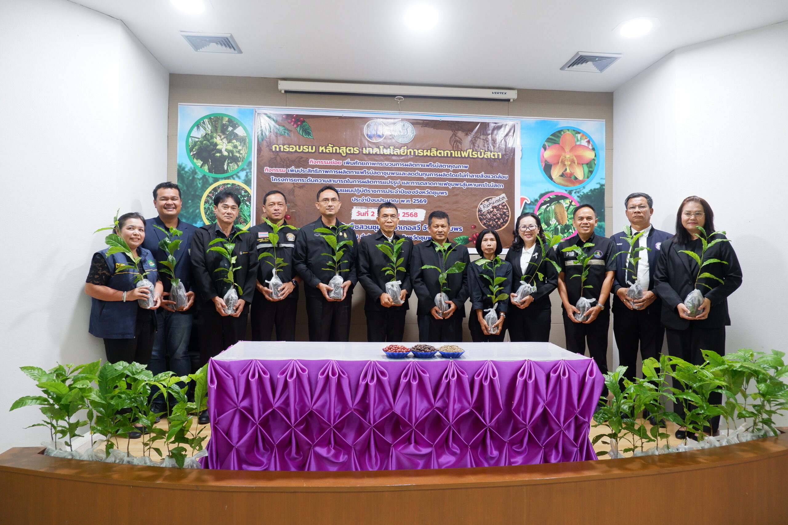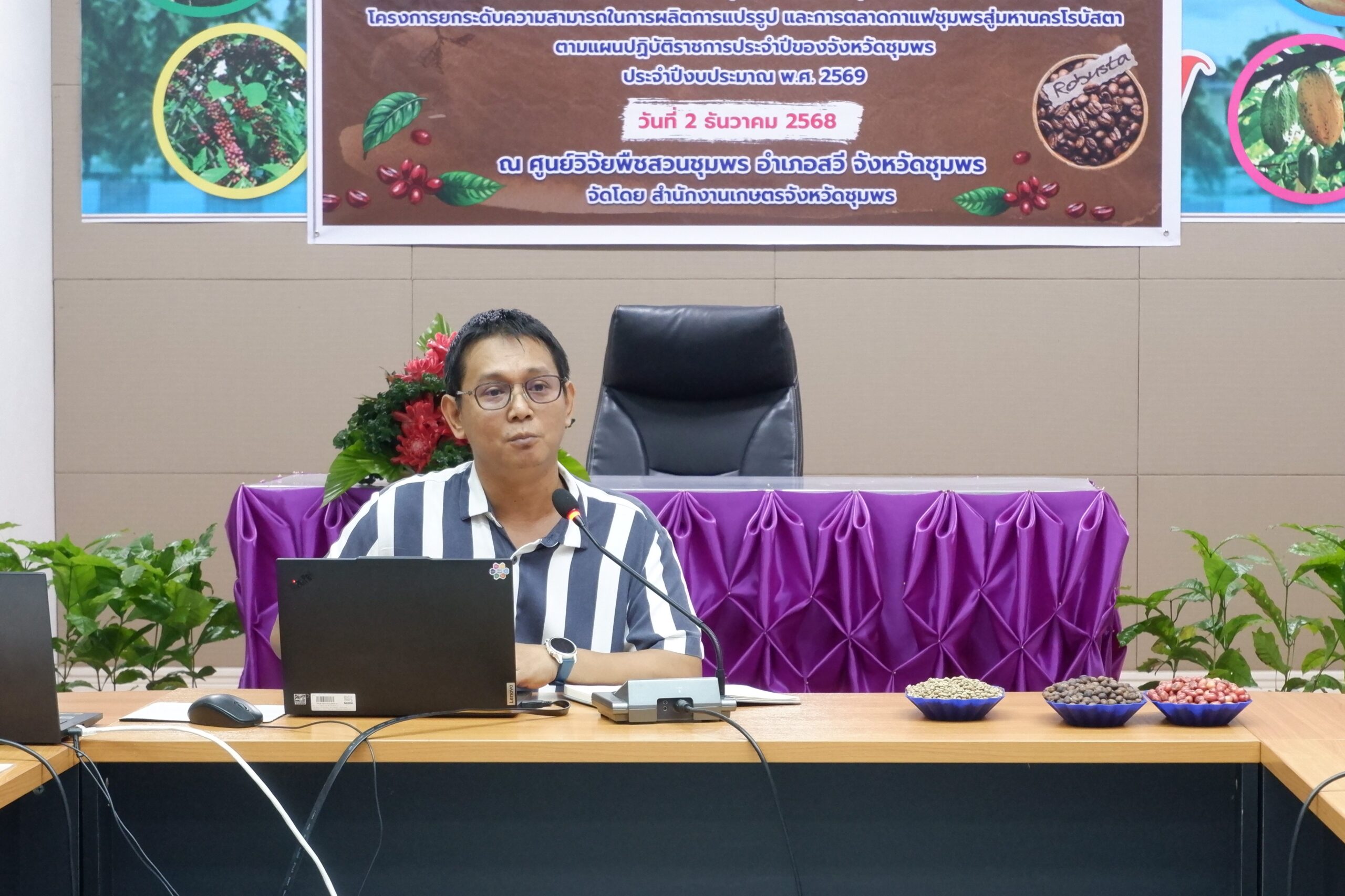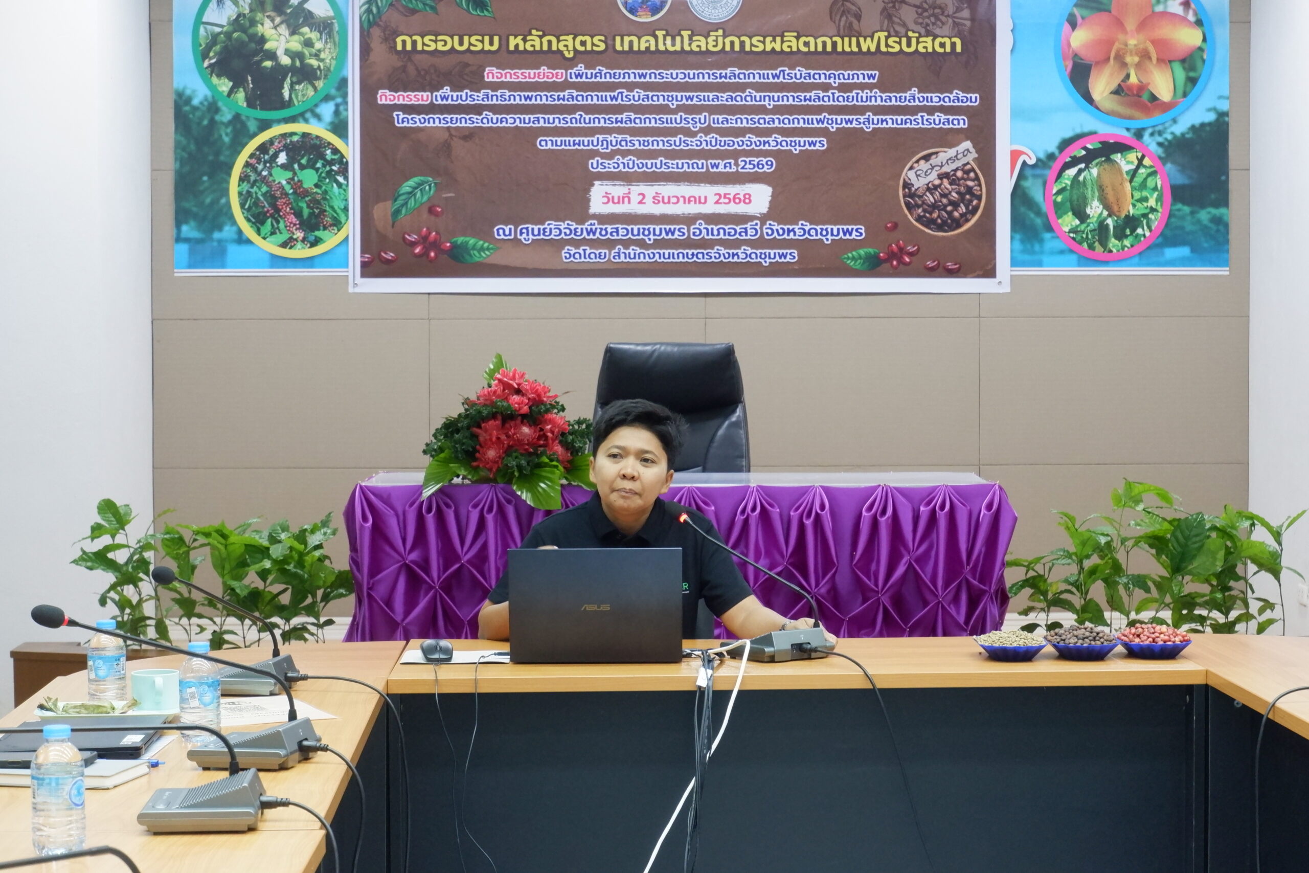 วันอังคารที่ 2 ธันวาคม พ.ศ. 2568 นางสาวทิพยา ไกรทอง ผู้อำนวยการศูนย์วิจัยพืชสวนชุมพร มอบหมายให้ นางสาวดารากร เผ่าชู นักวิชาการเกษตรชำนาญการ นางสาวอรทัย ธนัญชัย นักวิชาการเกษตรชำนาญการ และนางสาวพันธ์ทิพย์ มีสถิตย์ นักวิชาการเกษตรปฏิบัติการ เป็นวิทยากรในการอบรม หลักสูตร เทคโนโลยีการผลิตกาแฟโรบัสตา กิจกรรมเพิ่มประสิทธิภาพการผลิตกาแฟโรบัสตาชุมพร และลดต้นทุนการผลิตโดยไม่ทำลายสิ่งแวดล้อม โครงการยกระดับความสามารถในการผลิต การแปรรูป และการตลาดกาแฟชุมพรสู่มหานครโรบัสตา โครงการตามแผนปฏิบัติราชการประจำปีของจังหวัดชุมพร ประจำปีงบประมาณ พ.ศ. 2569 โดยมีนายสกุล ดำรงเกียรติกุล รองผู้ว่าราชการจังหวัดชุมพร เป็นประธานเปิดโครงการ มีวัตถุประสงค์เพื่อพัฒนาศักยภาพเกษตรกรในกระบวนการผลิตกาแฟคุณภาพ ตั้งแต่ต้นน้ำ กลางน้ำ และปลายน้ำ กลุ่มเป้าหมายประกอบด้วย เกษตรกรผู้ปลูกกาแฟในพื้นที่จังหวัดชุมพร จำนวน 50 ราย เจ้าหน้าที่สำนักงานเกษตรอำเภอที่เกี่ยวข้อง จำนวน 10 ราย รวมจำนวน 60 ราย ณ ห้องประชุมตึกอำนวยการ ศูนย์วิจัยพืชสวนชุมพร อ.สวี จ.ชุมพร