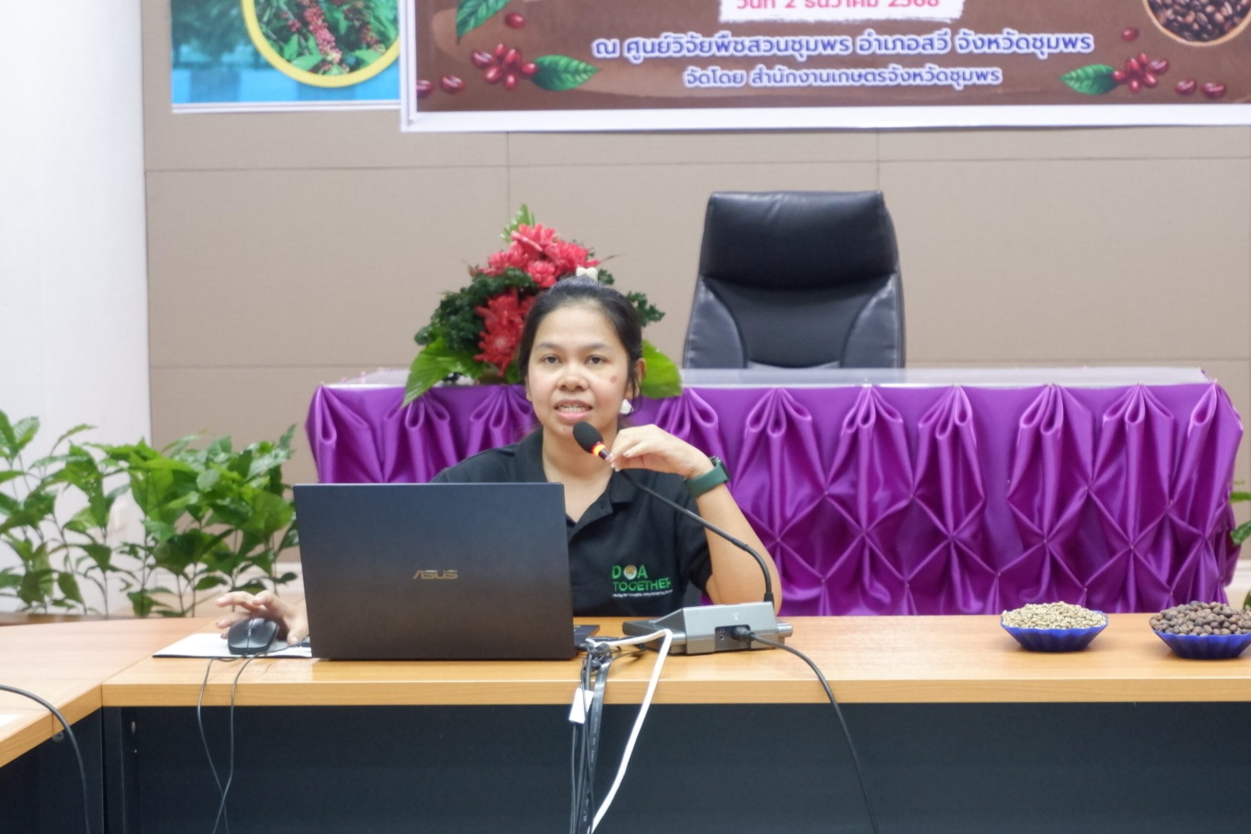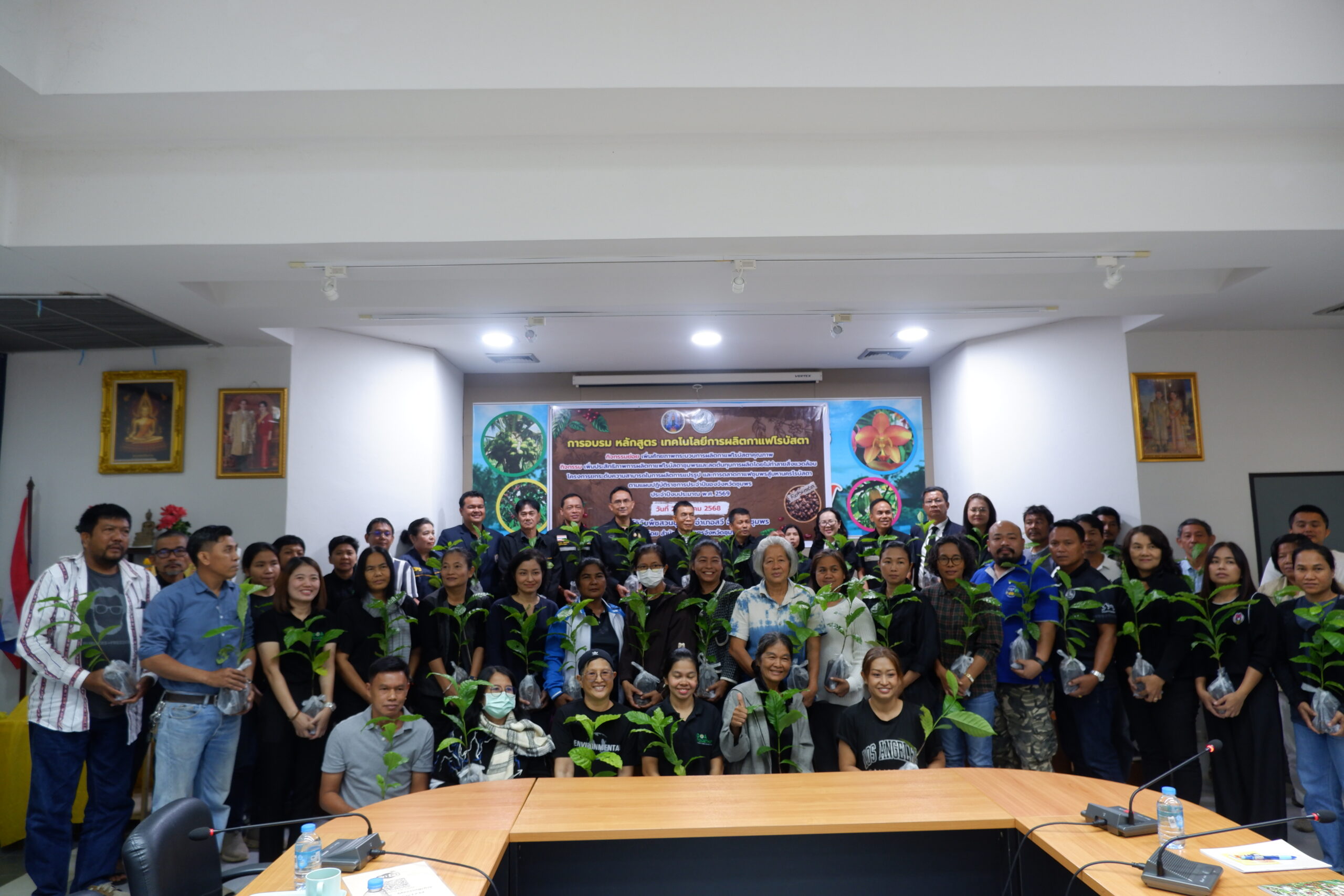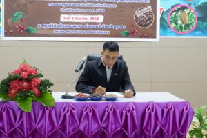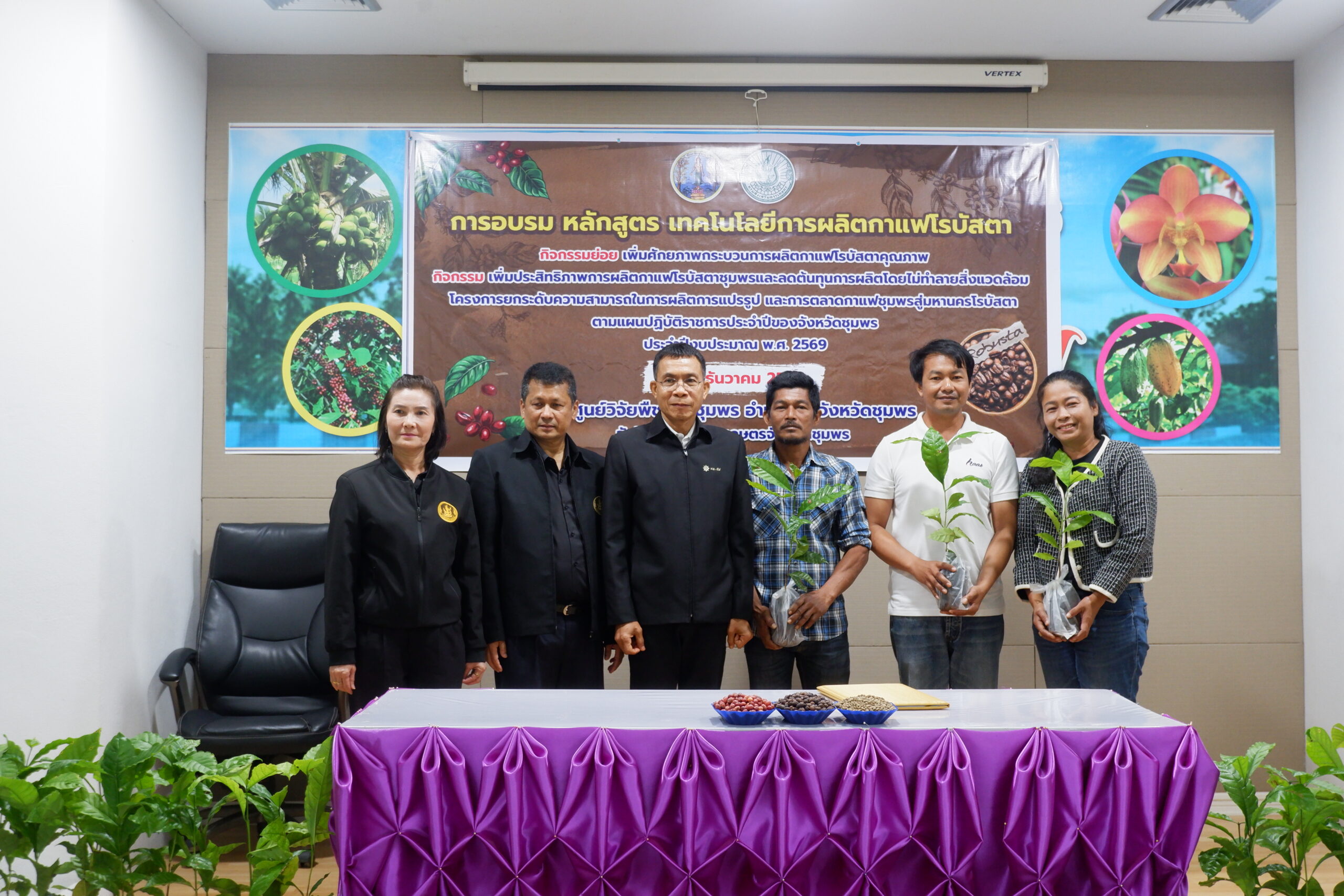 วันอังคารที่ 2 ธันวาคม พ.ศ. 2568 นางสาวทิพยา ไกรทอง ผู้อำนวยการศูนย์วิจัยพืชสวนชุมพร มอบหมายให้ นางสาวดารากร เผ่าชู นักวิชาการเกษตรชำนาญการ นางสาวอรทัย ธนัญชัย นักวิชาการเกษตรชำนาญการ และนางสาวพันธ์ทิพย์ มีสถิตย์ นักวิชาการเกษตรปฏิบัติการ เป็นวิทยากรในการอบรม หลักสูตร เทคโนโลยีการผลิตกาแฟโรบัสตา กิจกรรมเพิ่มประสิทธิภาพการผลิตกาแฟโรบัสตาชุมพร และลดต้นทุนการผลิตโดยไม่ทำลายสิ่งแวดล้อม โครงการยกระดับความสามารถในการผลิต การแปรรูป และการตลาดกาแฟชุมพรสู่มหานครโรบัสตา โครงการตามแผนปฏิบัติราชการประจำปีของจังหวัดชุมพร ประจำปีงบประมาณ พ.ศ. 2569 โดยมีนายสกุล ดำรงเกียรติกุล รองผู้ว่าราชการจังหวัดชุมพร เป็นประธานเปิดโครงการ มีวัตถุประสงค์เพื่อพัฒนาศักยภาพเกษตรกรในกระบวนการผลิตกาแฟคุณภาพ ตั้งแต่ต้นน้ำ กลางน้ำ และปลายน้ำ กลุ่มเป้าหมายประกอบด้วย เกษตรกรผู้ปลูกกาแฟในพื้นที่จังหวัดชุมพร จำนวน 50 ราย เจ้าหน้าที่สำนักงานเกษตรอำเภอที่เกี่ยวข้อง จำนวน 10 ราย รวมจำนวน 60 ราย ณ ห้องประชุมตึกอำนวยการ ศูนย์วิจัยพืชสวนชุมพร อ.สวี จ.ชุมพร