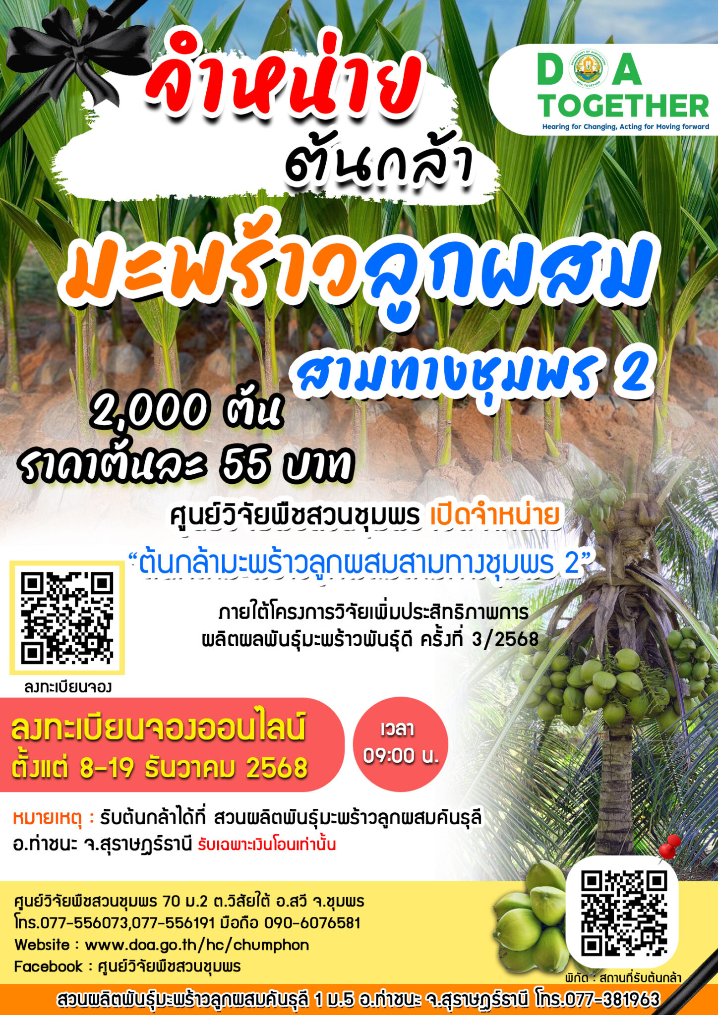 ด้วยศูนย์วิจัยพืชสวนชุมพร มีความประสงค์ จำหน่ายต้นกล้ามะพร้าวลูกผสมสามทางชุมพร 2 ครั้งที่ 3/2568 จำนวน 2,000 ต้น ราคาต้นละ 55 บาท