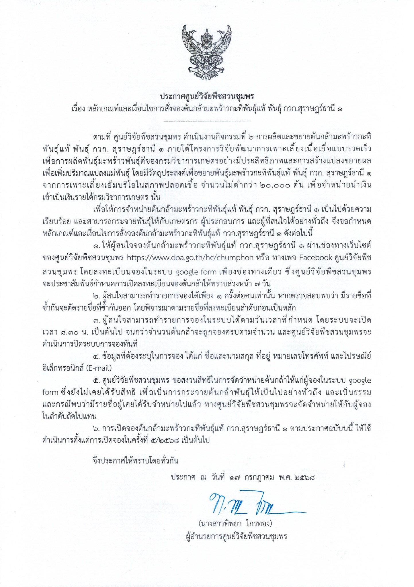 1. ชำระเงิน (โอนผ่านเข้าบัญชีของศูนย์วิจัยพืชสวนชุมพร กับเจ้าหน้าที่ศูนย์ฯ ณ วันที่ท่านมารับต้นกล้า) การจำหน่ายครั้งที่ 6/2568 ผู้ที่ได้รับต้นกล้าต้องมารับต้นกล้าที่ศูนย์วิจัยพืชสวนชุมพร เท่านั้น