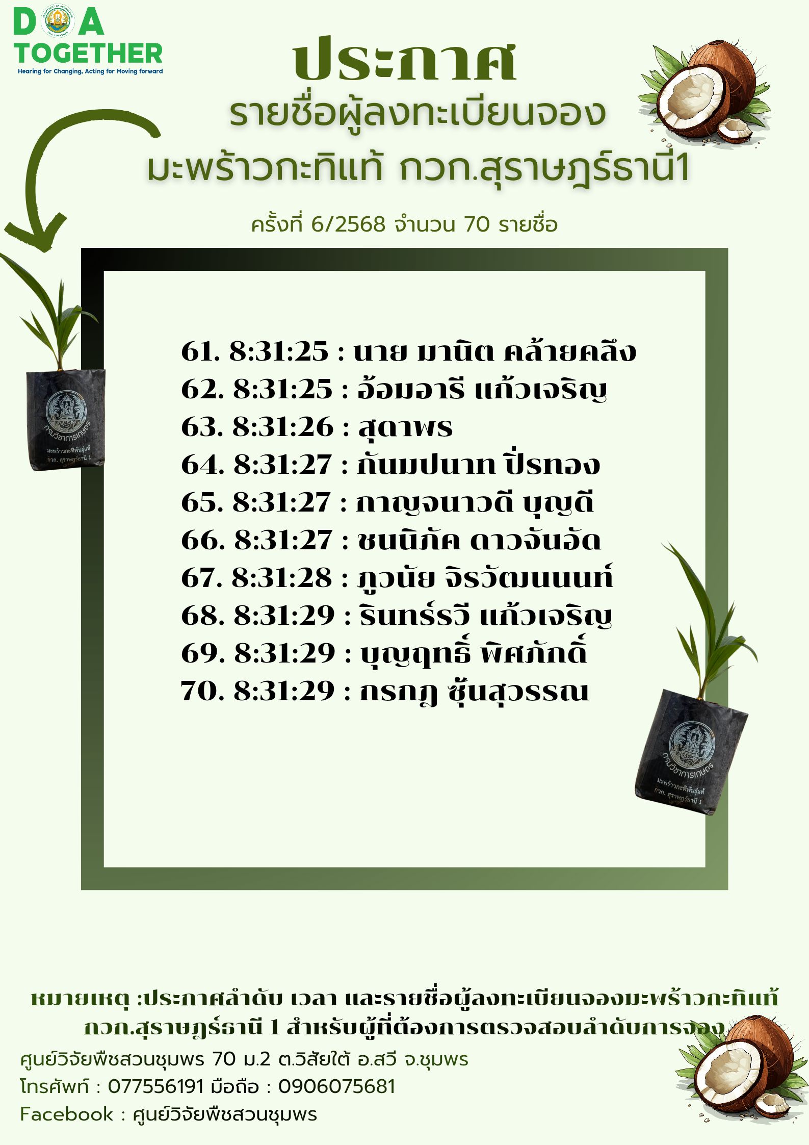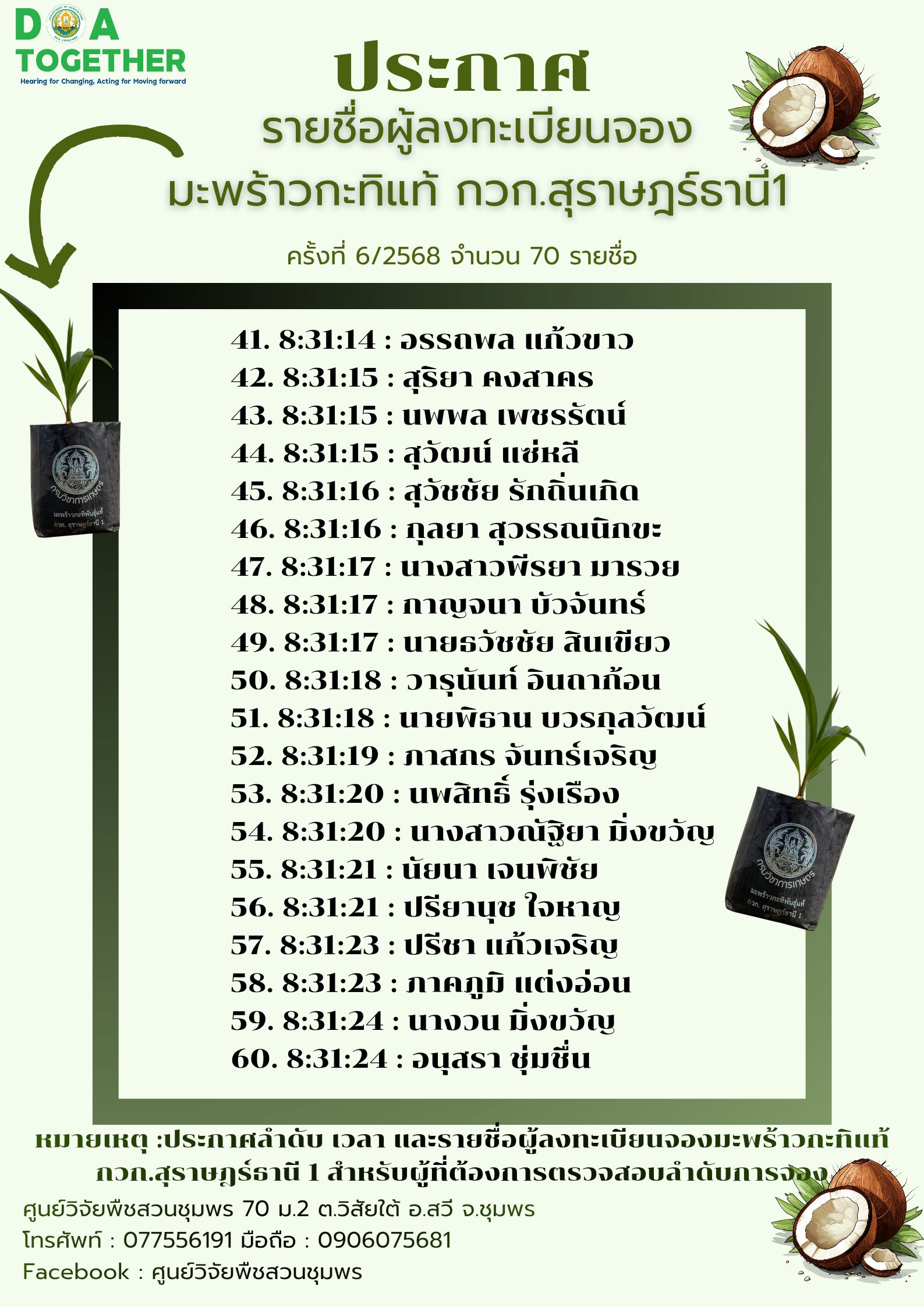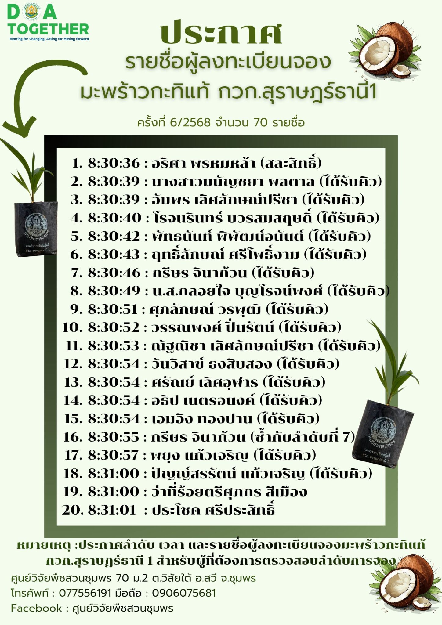 ประกาศรายชื่อผู้ลงทะเบียนจองมะพร้าวกะทิพันธุ์แท้ กวก.สุราษฎร์ธานี 1 ครั้งที่ 6/2568 ทั้งหมด 70 รายBy Pornnapat Chrc / 23 December 2568 Post Views: 8 FacebookFacebookXTwitterLINELine
