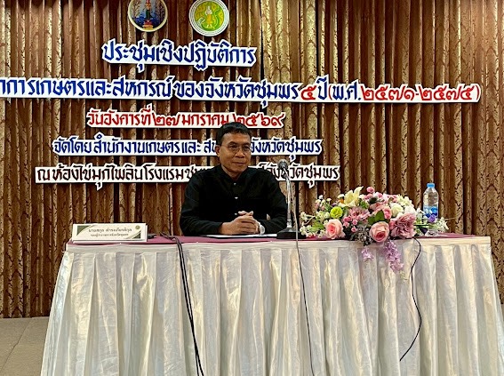 วันอังคารที่ 27 มกราคม 2569 เวลา 10.00 น. นางสาวทิพยา ไกรทอง ผู้อำนวยการศูนย์วิจัยพืชสวนชุมพร มอบหมาย นางสาวณิชชา แหลมเพ็ชร์ ผู้อำนวยการกลุ่มวิจัย การร่วมประชุมเชิงปฏิบัติการจัดทำแผนพัฒนาการเกษตรและสหกรณ์ของจังหวัดชุมพร 5 ปี (พ.ศ.2571-2575) โดยมีวัตถุประสงค์เพื่อรับฟังปัญหา ความต้องการ และความคาดหวังของผู้มีส่วนได้เสีย รวมถึงการวิเคราะห์สภาพแวดล้อมด้านการเกษตรและสหกรณ์ของจังหวัด เพื่อเป็นข้อมูลประกอบการจัดทำแผนพัฒนาการเกษตรและสหกรณ์ของจังหวัดชุมพร 5 ปี (พ.ศ.2571-2575) ณ ห้องประชุมไข่มุกไพลิน โรงแรมชุมพรการ์เดนส์ อำเภอเมืองชุมพร จังหวัดชุมพร