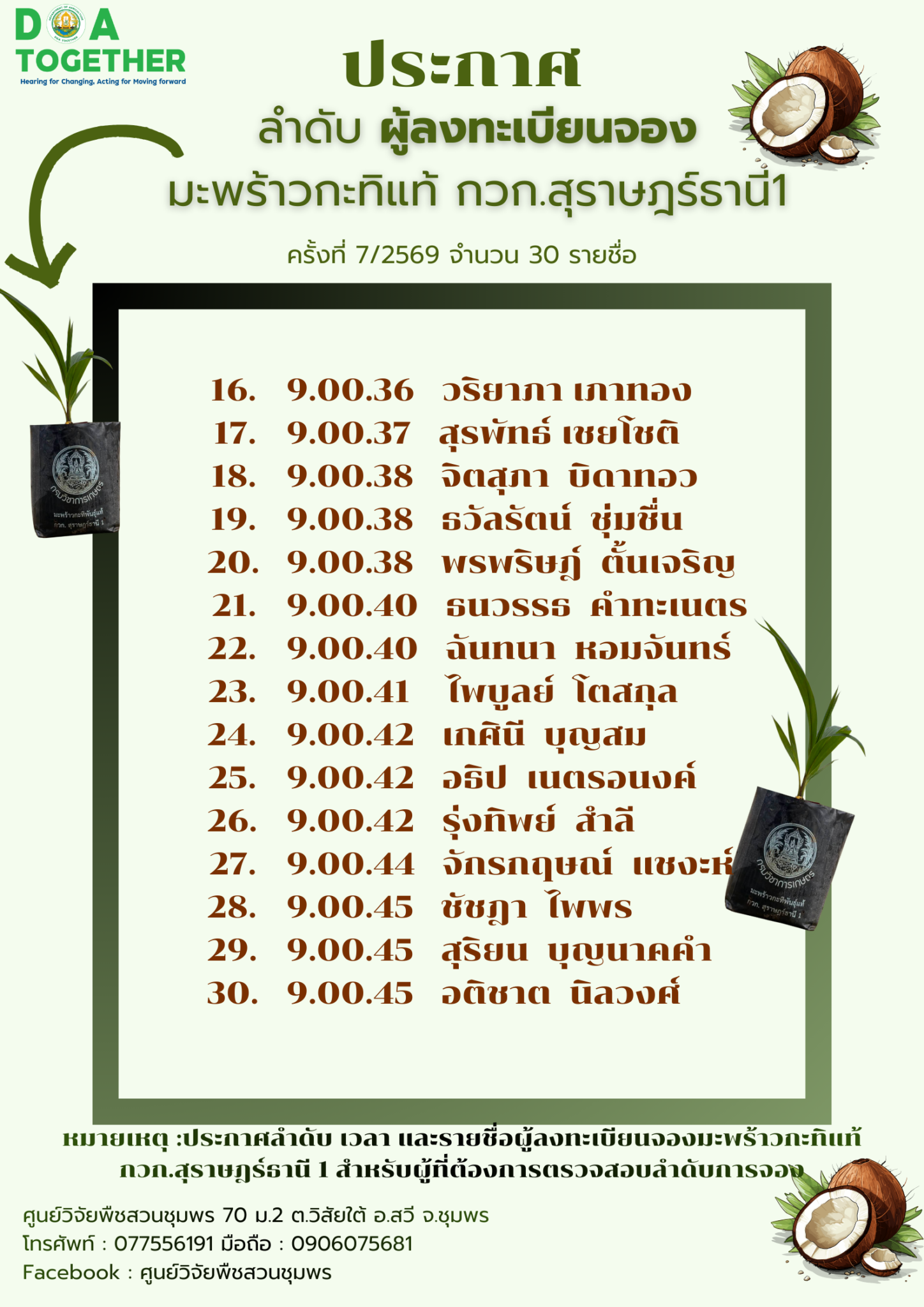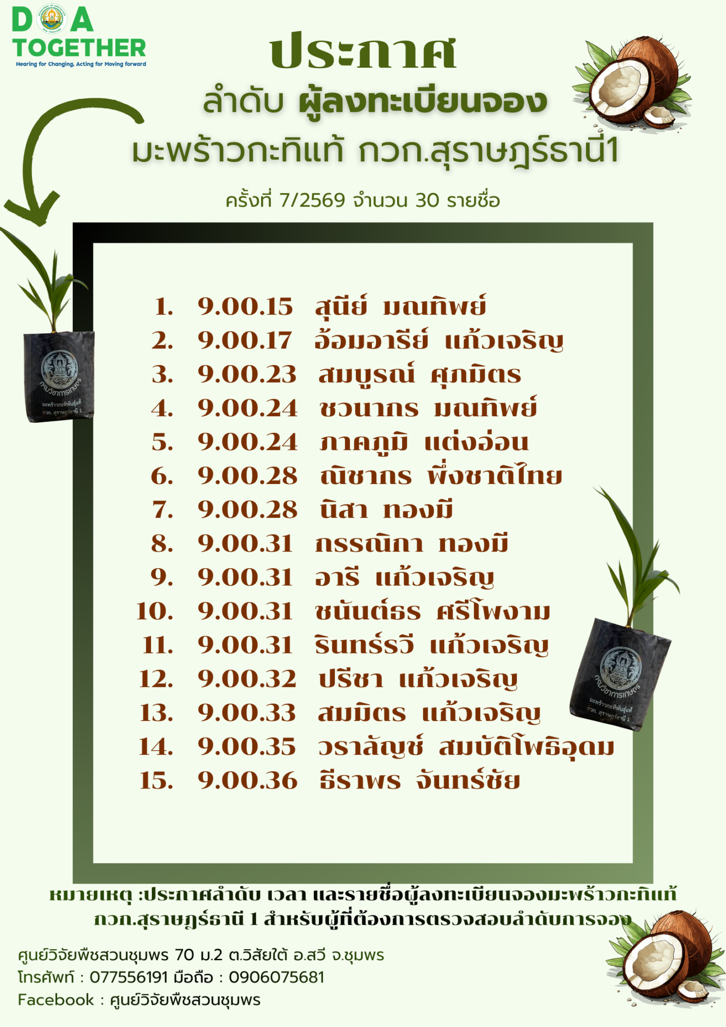 ประกาศรายชื่อผู้ลงทะเบียนจองต้นกล้ามะพร้าวกะทิพันธุ์แท้ กวก.สุราษฎร์ธานี 1 ครั้งที่ 7/2569 จำนวน 30 รายBy Pornnapat Chrc / 25 February 2569 Post Views: 24 FacebookFacebookXTwitterLINELine