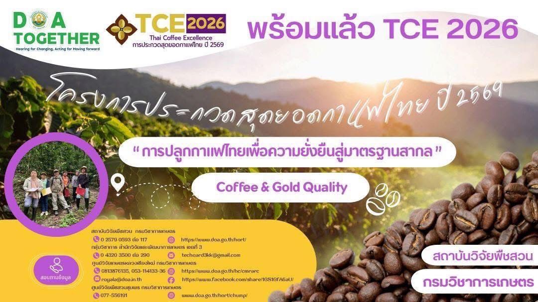 ศูนย์วิจัยพืชสวนชุมพร กรมวิชาการเกษตร เดินหน้าโครงการ TCE 2026 พร้อมปั้นเกษตรกรไทยสู่ความ เป็นเลิศด้านกาแฟสากลBy Pornnapat Chrc / 27 February 2569 ศูนย์วิจัยพืชสวนชุมพร กรมวิชาการเกษตร เตรียมประกวดโครงการประกวดสุดยอดกาแฟไทย ปี 2569 (TCE 2026) “การปลูกกาแฟไทยเพื่อความยั่งยืนสู่มาตรฐานสากล”สอบถามข้อมูลเพิ่มเติมได้ที่สถาบันวิจัยพืชสวน กรมวิชาการเกษตร โทร. 02-579 0593 ต่อ 107กลุ่มวิชาการ สำนักวิจัยและพัฒนาการเกษตร เขตที่ 3 โทร. 043-203500 ต่อ 290ศูนย์วิจัยเกษตรหลวงเชียงใหม่ กรมวิชาการเกษตร โทร. 081-3876135, 053-114133-6ศูนย์วิจัยพืชสวนชุมพร กรมวิชาการเกษตร โทร. 077-556191 Post Views: 10 FacebookFacebookXTwitterLINELine