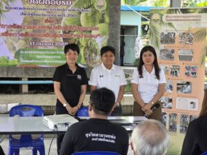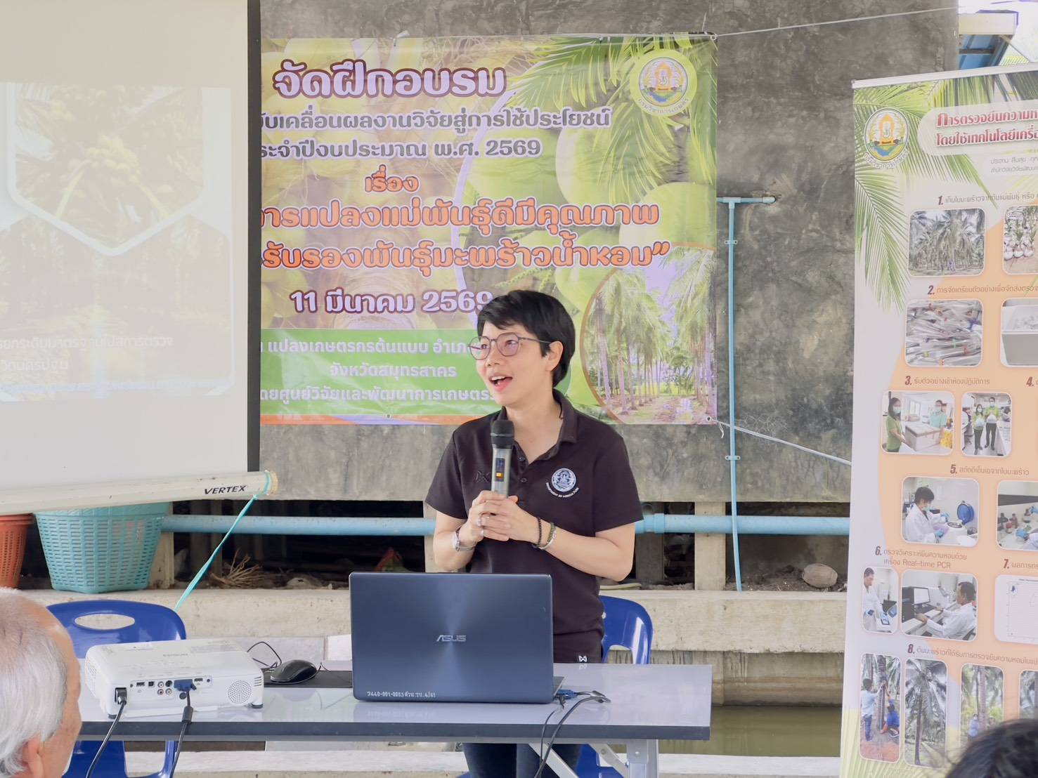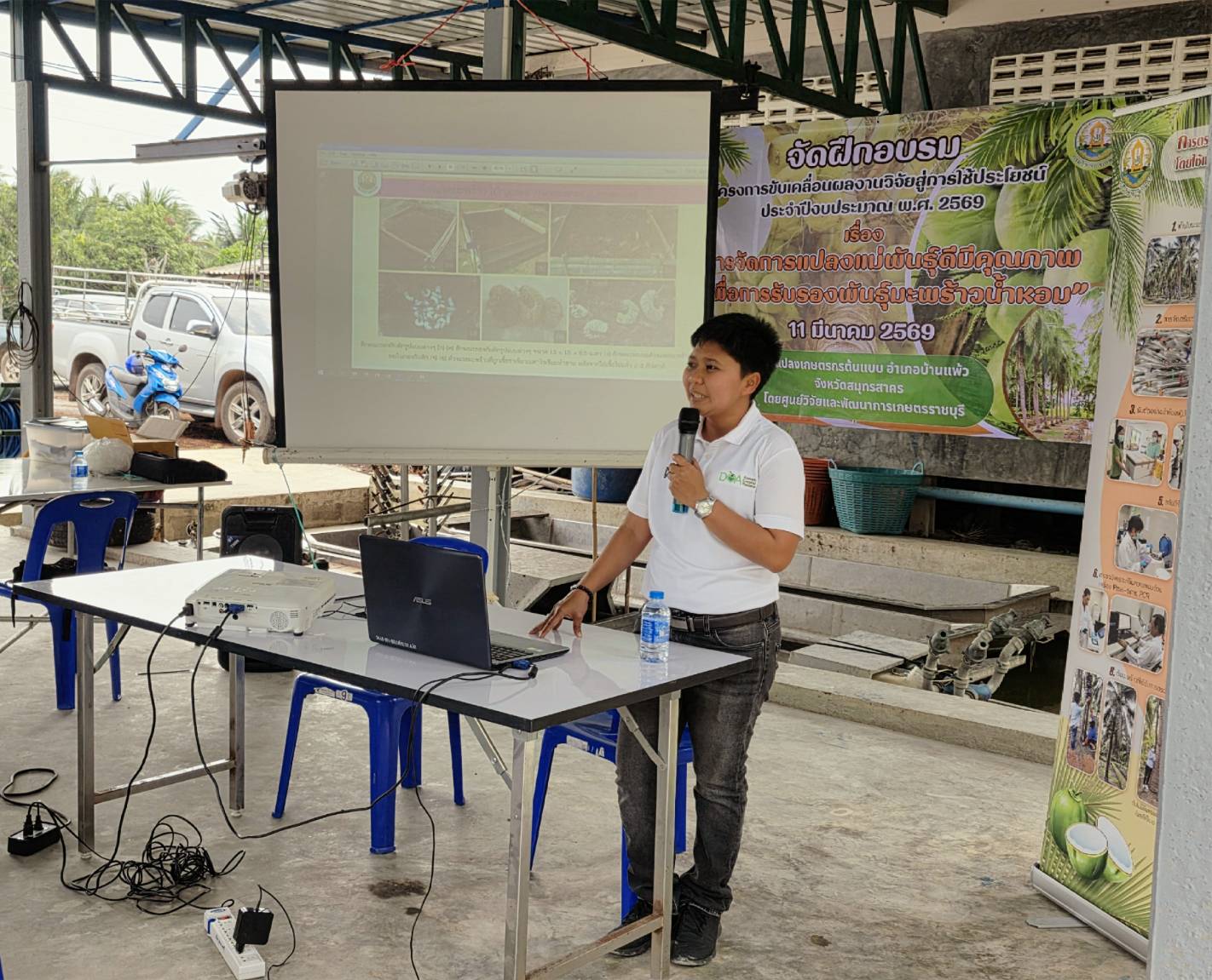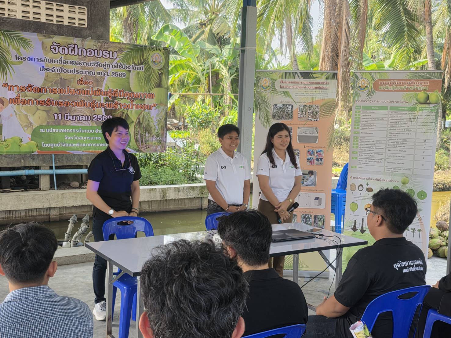 วันพุธที่ 11 มีนาคม พ.ศ. 2569 นางสาวดารากร เผ่าชู นักวิชาการเกษตรชำนาญการ และนางสาวหยกทิพย์ สุดารีย์ นักวิชาการเกษตรชำนาญการ เป็นวิทยากรให้ความรู้โครงการขับเคลื่อนผลงานวิจัยสู่การใช้ประโยชน์ ประจำปีงบประมาณ พ.ศ. 2569 การฝึกอบรมเพื่อถ่ายทอดความรู้และขยายผลเทคโนโลยีสู่เกษตรกรกลุ่มเป้าหมาย เรื่อง “การจัดการแปลงแม่พันธุ์ดีมีคุณภาพเพื่อการรับรองพันธุ์มะพร้าวน้ำหอม” รุ่นที่ 1 จัดโดย ศูนย์วิจัยและพัฒนาการเกษตรราชบุรี ณ แปลงเกษตรกรต้นแบบ อำเภอบ้านแพ้ว จังหวัดสมุทรสาคร