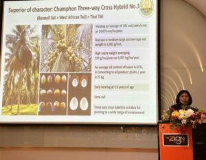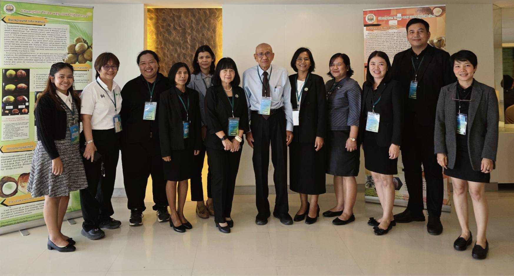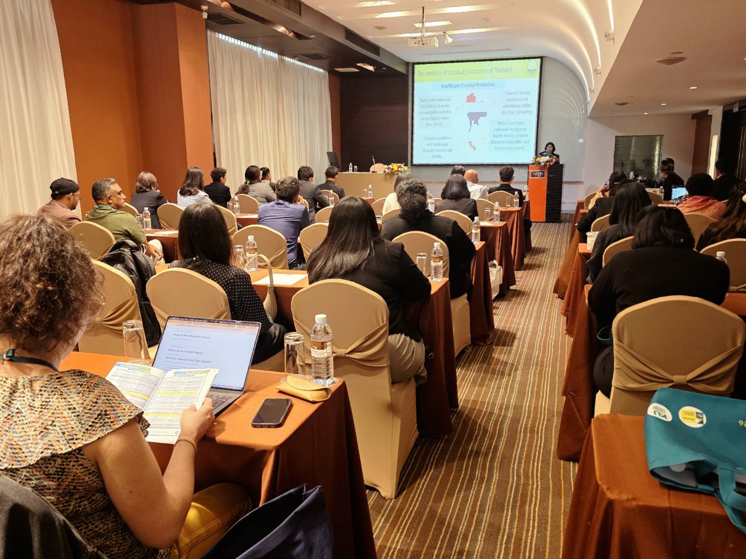 ในการนี้ ได้เข้าร่วมการประชุมใน Technical Session : Resilient Coconut Future : Bridging Genetics, Smart Agriculture, and the Bioeconomy และบรรยายภายใต้หัวข้อ “Sustainable production and dissemination of Three way cross hybrid coconuts to Thai farmer โดยเน้นย้ำการปรับปรุงและพัฒนาพันธุ์มะพร้าวลูกผสมสามทางของศูนย์วิจัยพืชสวนชุมพร กรมวิชาการเกษตร และการกระจายพันธุ์เพื่อเพิ่มปริมาณ และคุณภาพผลผลิตในภาคการเกษตร และรองรับอุตสาหกรรมมะพร้าว ด้วยเทคโนโลยีการผลิตพันธุ์สู่กลุ่มผู้ใช้ประโยชน์ พร้อมภาคปฏิบัติในการทำ Workshop on Coconut Genomics : From Coconut DNA to Breeding Application” ในหัวข้อ Coconut Genomics Landscape, SNP Data Handling & Quality Control, Genetic Diversity & Population Structure, GWAS and Trait Mapping in coconut, Genomic Selection for Coconut, Data Sharing & International Collaboration and Discussion & Future Roadmap โดยมีวัตถุประสงค์ เพื่อการบูรณาการเทคโนโลยีชีวภาพสมัยใหม่เข้ากับงานปรับปรุงพันธุ์มะพร้าว ในการแก้ปัญหาข้อจำกัดดั้งเดิม และเพิ่มศักยภาพในการแข่งขันของอุตสาหกรรมมะพร้าว ซึ่งเป็นประโยชน์ในการลดระยะเวลาในการปรับปรุงพันธุ์ให้เร็ว และมีประสิทธิภาพมากขึ้น และช่วยให้นักวิจัย ระบุยีนที่ควบคุมลักษณะสำคัญทางเศรษฐกิจได้อย่างแม่นยำจากการคัดเลือกด้วยเครื่องหมายโมเลกุล ระบุสายพันธุ์จากการใช้ข้อมูลจีโนมในการจำแนกความหลากหลายทางพันธุกรรมของมะพร้าวในแหล่งต่างๆ เพื่อการบริหารจัดการธนาคารเชื้อพันธุ์ (Genebank) ต่อไป