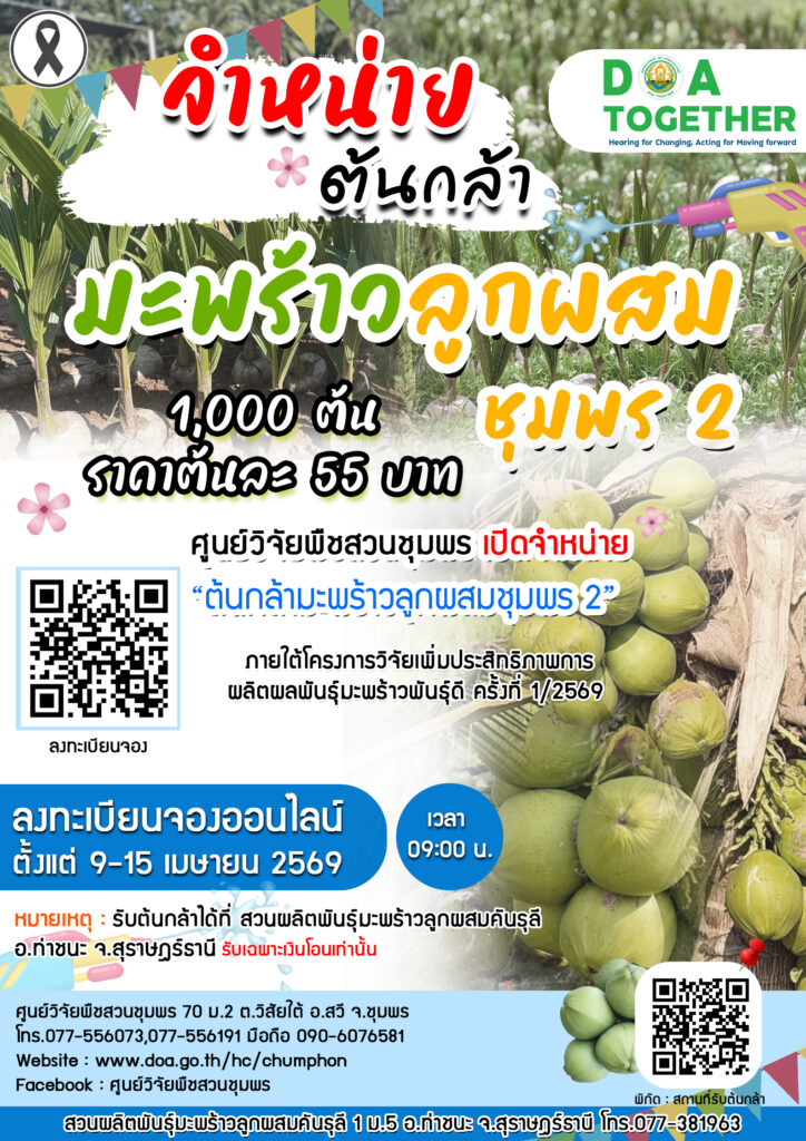 ด้วยศูนย์วิจัยพืชสวนชุมพร มีความประสงค์ จำหน่ายต้นกล้ามะพร้าวลูกผสมชุมพร 2 ครั้งที่ 1/2569 จำนวน 1,000 ต้น ราคาต้นละ 55 บาท