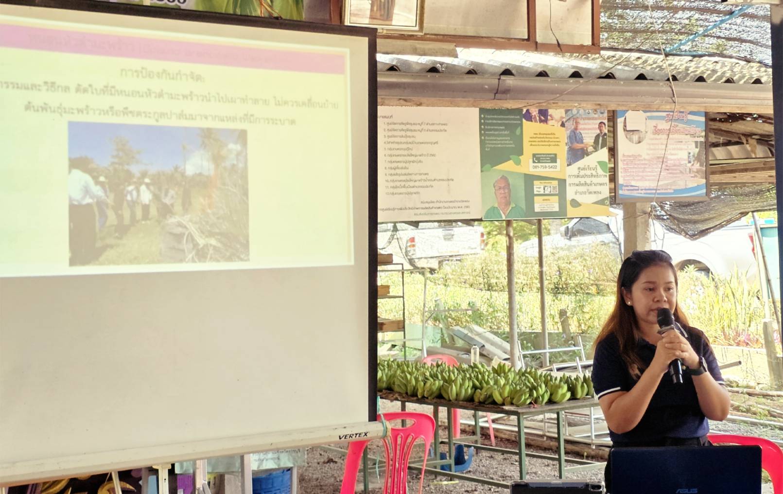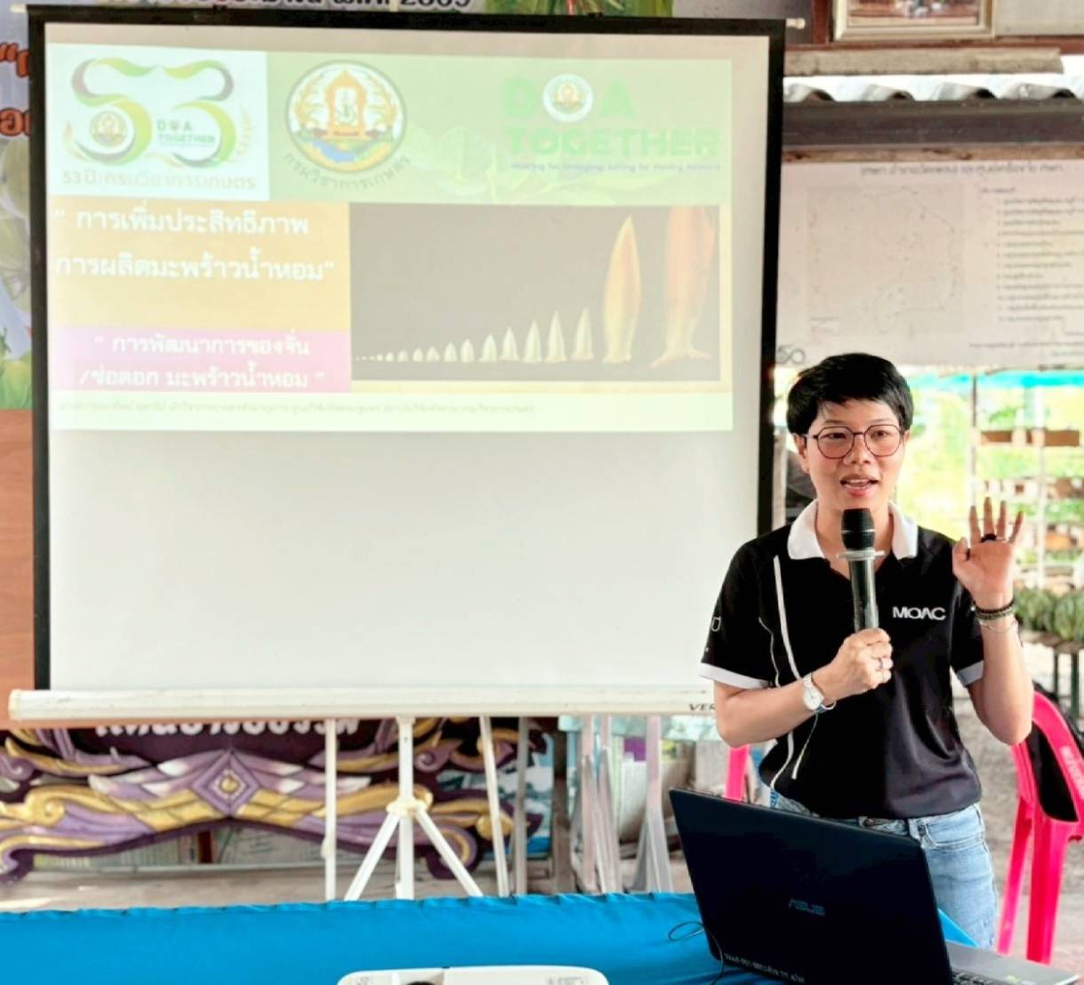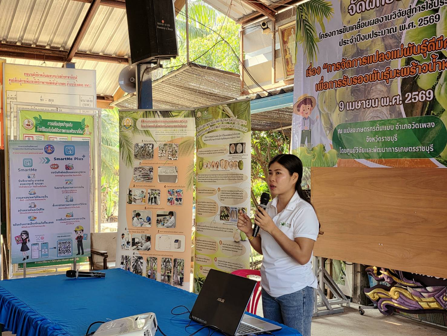 วันพฤหัสบดีที่ 9 เมษายน พ.ศ. 2569 นางสาวหยกทิพย์ สุดารีย์ นักวิชาการเกษตรชำนาญการ และนางสาวพันธํทิพย์ มีสถิตย์ นักวิชาการเกษตรปฏิบัติการ เป็นวิทยากรให้ความรู้โครงการขับเคลื่อนผลงานวิจัยสู่การใช้ประโยชน์ ประจำปีงบประมาณ พ.ศ. 2569 การฝึกอบรมเพื่อถ่ายทอดความรู้และขยายผลเทคโนโลยีสู่เกษตรกรกลุ่มเป้าหมาย เรื่อง “การจัดการแปลงแม่พันธุ์ดีมีคุณภาพเพื่อการรับรองพันธุ์มะพร้าวน้ำหอม” รุ่นที่ 2 จัดโดย ศูนย์วิจัยและพัฒนาการเกษตรราชบุรี ณ แปลงเกษตรกรต้นแบบ อำเภอวัดเพลง จังหวัดราชบุรี