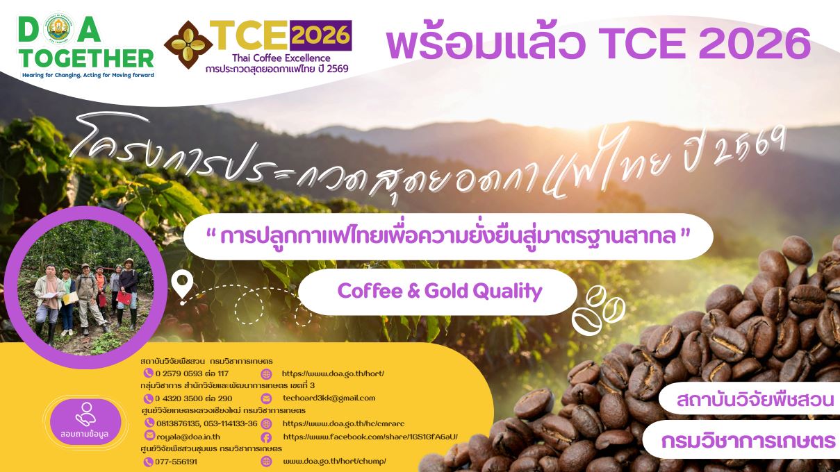 การประกวดข่าวกิจกรรมข่าวประชาสัมพันธ์ สถาบันวิจัยพืชสวน กรมวิชาการเกษตร เดินหน้าโครงการ TCE 2026 พร้อมปั้นเกษตรกรไทยสู่ความ เป็นเลิศด้านกาแฟสากล 23/02/2569 ว่าที่ร้อยตรีชยพล เดชาคุ้ม สถาบันวิจัยพืขสวน กรมวิชาการเกษตร เตรียมประกวดโครงการประกวดสุดยอดกาแฟไทย ปี 2569 (TCE 2026) “การปลูกกาแฟไทยเพื่อความยั่งยืนสู่มาตรฐานสากล”สอบถามข้อมูลเพิ่มเติมได้ที่สถาบันวิจัยพืชสวน กรมวิชาการเกษตร โทร. 02-579 0593 ต่อ 107กลุ่มวิชาการ สำนักวิจัยและพัฒนาการเกษตร เขตที่ 3 โทร. 043-203500 ต่อ 290ศูนย์วิจัยเกษตรหลวงเชียงใหม่ กรมวิชาการเกษตร โทร. 081-3876135, 053-114133-6ศูนย์วิจัยพืชสวนชุมพร กรมวิชาการเกษตร โทร. 077-556191 FacebookFacebookXTwitterLINELine