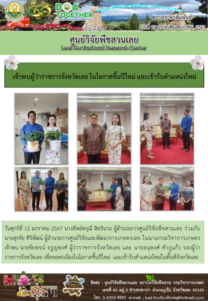 วันศุกร์ที่ 12 มกราคม 2567 นางทิพย์ดรุณี สิทธินาม ผู้อำนวยการศูนย์วิจัยพืชสวนเลย ร่วมกับ นายสุรชัย ศิริพัฒน์ ผู้อำนวยการศูนย์วิจัยและพัฒนาการเกษตรเลย ในนามกรมวิชาการเกษตร เข้าพบ นายชัยพจน์ จรูญพงศ์ ผู้ว่าราชการจังหวัดเลย และ นายอนุพงศ์ คำภูแก้ว รองผู้ว่าราชการจังหวัดเลย เพื่อขอพรเนื่องในโอกาสขึ้นปีใหม่ และเข้ารับตำแหน่งใหม่ในพื้นที่จังหวัดเลย