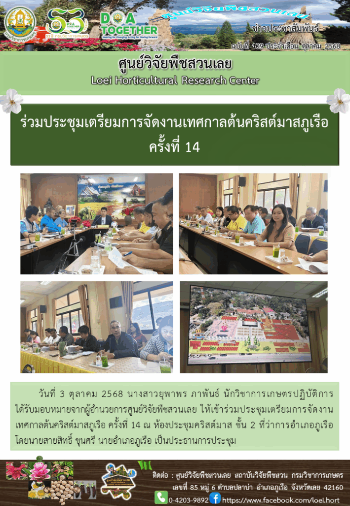 วันที่ 3 ตุลาคม 2568 นางสาวยุพาพร ภาพันธ์ นักวิชาการเกษตรปฏิบัติการ ได้รับมอบหมายจากผู้อำนวยการศูนย์วิจัยพืชสวนเลย ให้เข้าร่วมประชุมเตรียมการจัดงานเทศกาลต้นคริสต์มาสภูเรือ ครั้งที่ 14 ณ ห้องประชุมคริสต์มาส ชั้น 2 ที่ว่าการอำเภอภูเรือ โดยนายสายสิทธิ์ ขุนศรี นายอำเภอภูเรือ เป็นประธานการประชุม