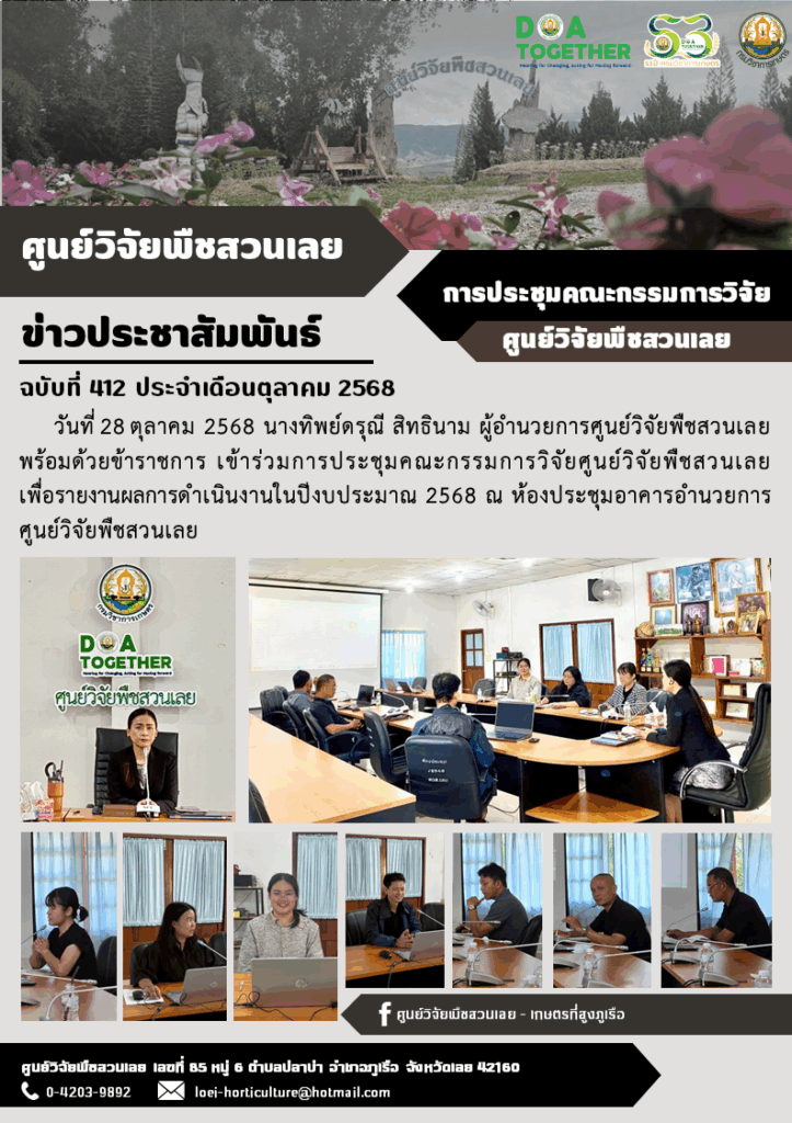 วันที่ 28 ตุลาคม 2568 นางทิพย์ดรุณี สิทธินาม ผู้อำนวยการศูนย์วิจัยพืชสวนเลย พร้อมด้วยข้าราชการ เข้าร่วมการประชุมคณะกรรมการวิจัยศูนย์วิจัยพืชสวนเลย เพื่อรายงานผลการดำเนินงานในปีงบประมาณ 2568 ณ ห้องประชุมอาคารอำนวยการ ศูนย์วิจัยพืชสวนเลย