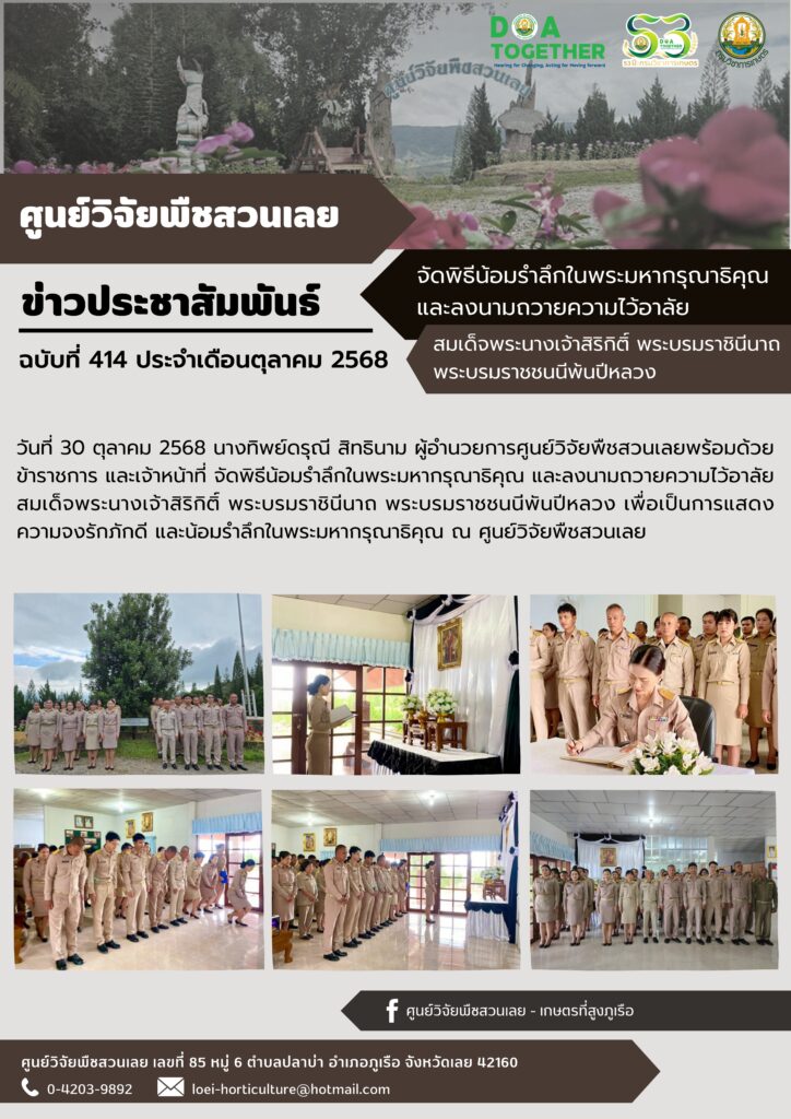 วันที่ 30 ตุลาคม 2568 นางทิพย์ดรุณี สิทธินาม ผู้อำนวยการศูนย์วิจัยพืชสวนเลย พร้อมด้วยข้าราชการ และเจ้าหน้าที่ จัดพิธีน้อมรำลึกในพระมหากรุณาธิคุณ และลงนามถวายความไว้อาลัย สมเด็จพระนางเจ้าสิริกิติ์ พระบรมราชินีนาถ พระบรมราชชนนีพันปีหลวง เพื่อเป็นการแสดงความจงรักภักดี และน้อมรำลึกในพระมหากรุณาธิคุณ ณ ศูนย์วิจัยพืชสวนเลย