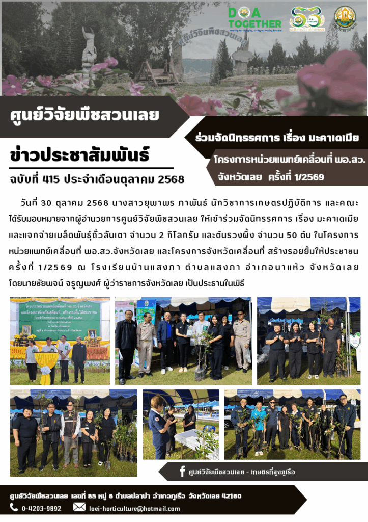 วันที่ 30 ตุลาคม 2568 นางสาวยุพาพร ภาพันธ์ นักวิชาการเกษตรปฏิบัติการ และคณะ ได้รับมอบหมายจากผู้อำนวยการศูนย์วิจัยพืชสวนเลย ให้เข้าร่วมจัดนิทรรศการ เรื่อง มะคาเดเมีย และแจกจ่ายเมล็ดพันธุ์ถั่วลันเตา จำนวน 2 กิโลกรัม และต้นรวงผึ้ง จำนวน 50 ต้น ในโครงการหน่วยแพทย์เคลื่อนที่ พอ.สว.จังหวัดเลย และโครงการจังหวัดเคลื่อนที่ สร้างรอยยิ้มให้ประชาชน ครั้งที่ 1/2569 ณ โรงเรียนบ้านแสงภา ตำบลแสงภา อำเภอนาแห้ว จังหวัดเลย โดยนายชัยพจน์ จรูญพงศ์ ผู้ว่าราชการจังหวัดเลย เป็นประธานในพิธี