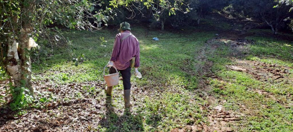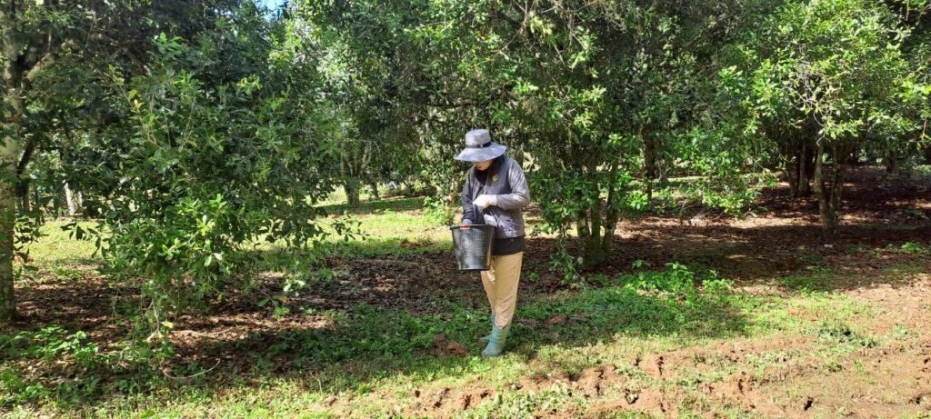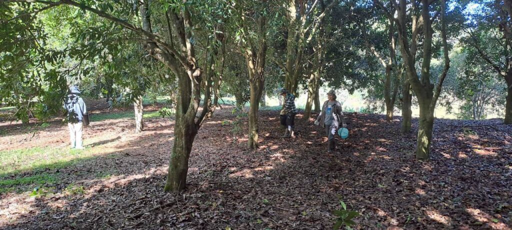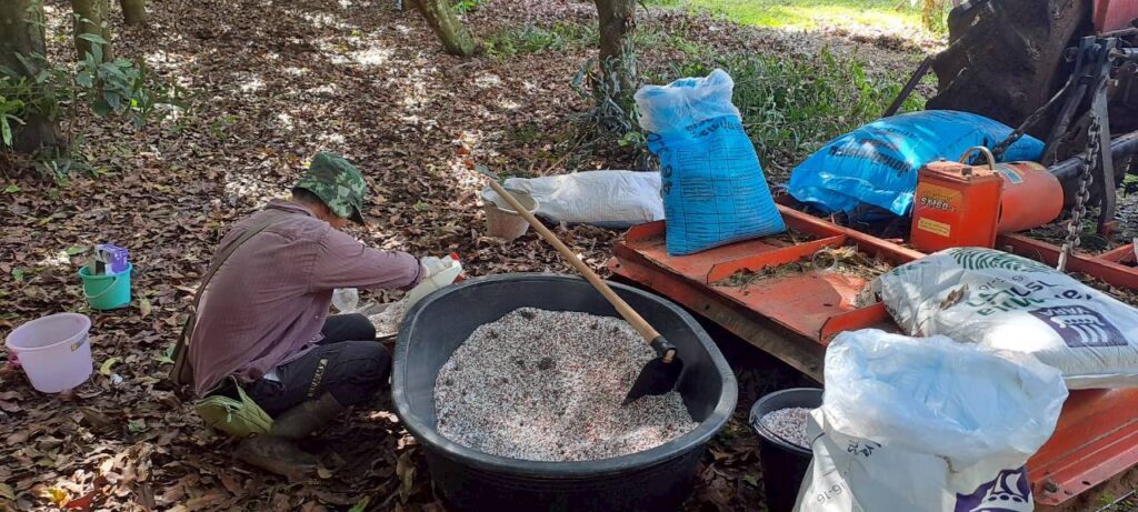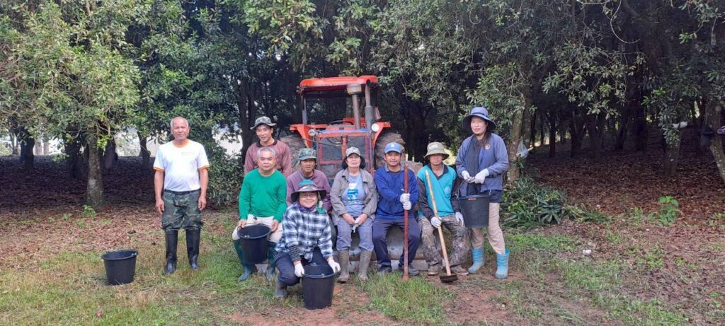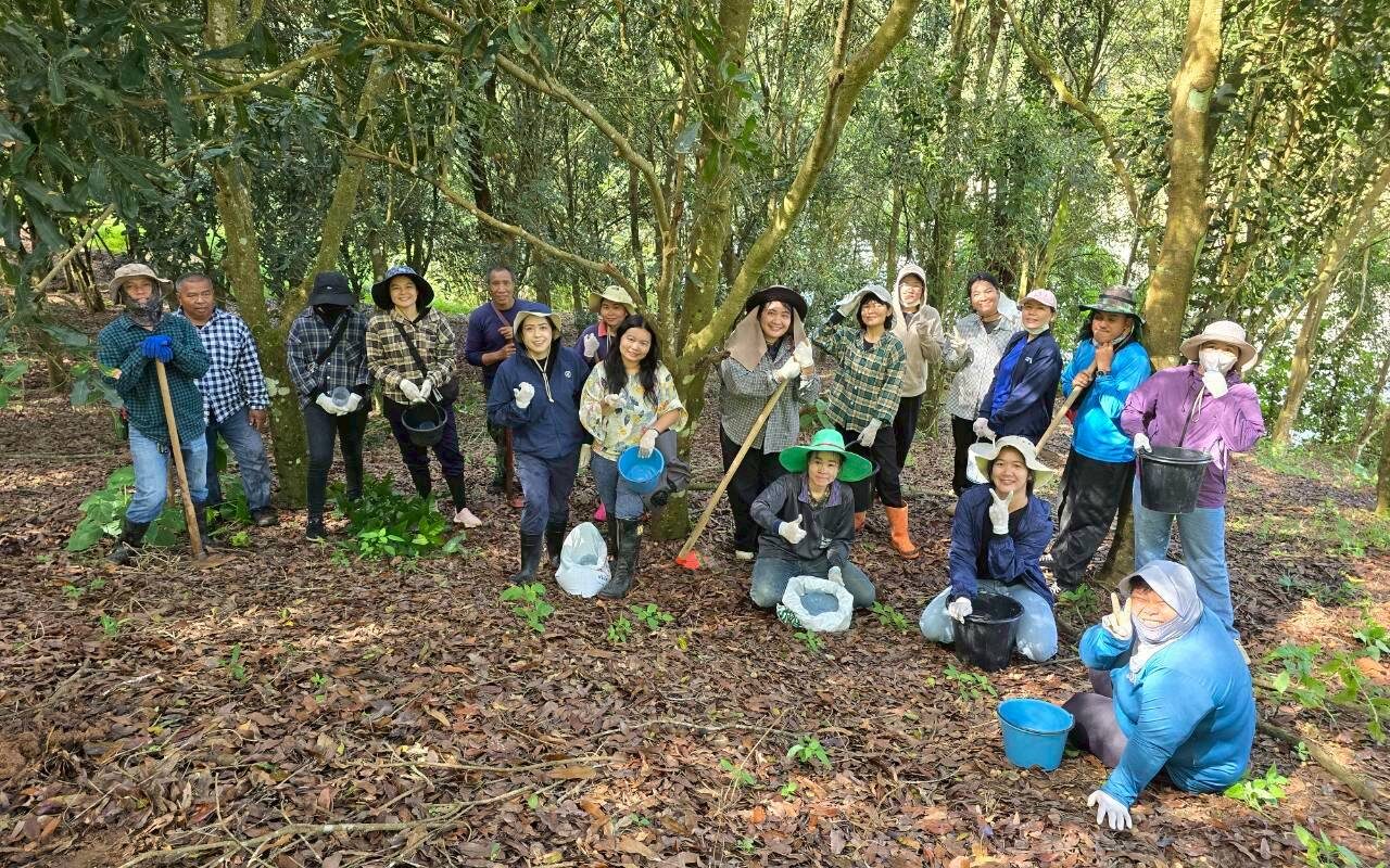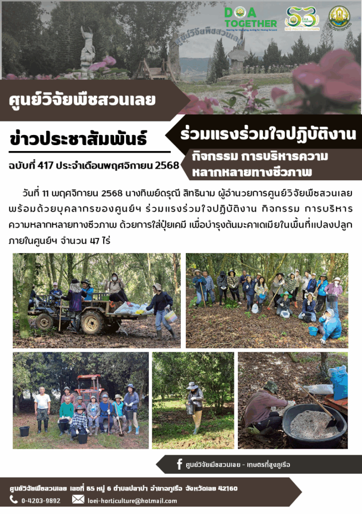 วันที่ 11 พฤศจิกายน 2568 นางทิพย์ดรุณี สิทธินาม ผู้อำนวยการศูนย์วิจัยพืชสวนเลย พร้อมด้วยบุคลากรของศูนย์ฯ ร่วมแรงร่วมใจปฏิบัติงาน กิจกรรม การบริหารความหลากหลายทางชีวภาพ ด้วยการใส่ปุ๋ยเคมี เพื่อบำรุงต้นมะคาเดเมียในพื้นที่แปลงปลูกภายในศูนย์ฯ จำนวน 47 ไร่