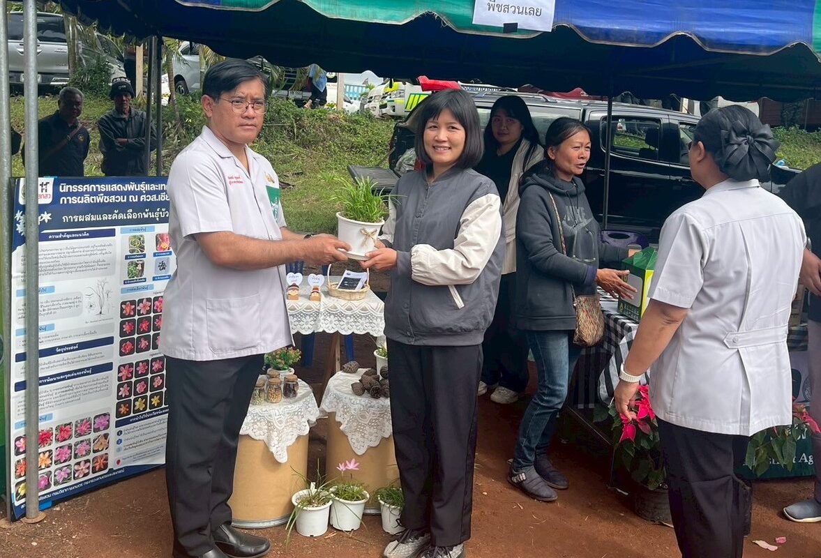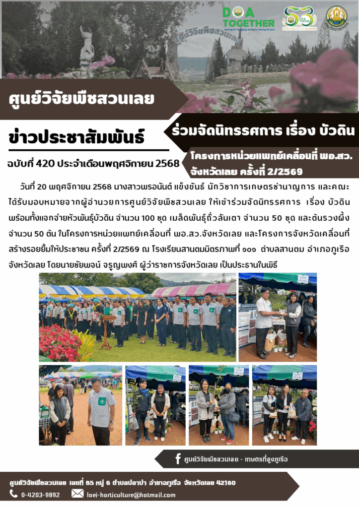 วันที่ 20 พฤศจิกายน 2568 นางสาวพรอนันต์ แข็งขันธ์ นักวิชาการเกษตรชำนาญการ และคณะ ได้รับมอบหมายจากผู้อำนวยการศูนย์วิจัยพืชสวนเลย ให้เข้าร่วมจัดนิทรรศการ เรื่อง บัวดิน พร้อมทั้งแจกจ่ายหัวพันธุ์บัวดิน จำนวน 100 ชุด เมล็ดพันธุ์ถั่วลันเตา จำนวน 50 ชุด และต้นรวงผึ้ง จำนวน 50 ต้น ในโครงการหน่วยแพทย์เคลื่อนที่ พอ.สว.จังหวัดเลย และโครงการจังหวัดเคลื่อนที่สร้างรอยยิ้มให้ประชาชน ครั้งที่ 2/2569 ณ โรงเรียนสานตมมิตรภาพที่ ๑๐๑ ตำบลสานตม อำเภอภูเรือ จังหวัดเลย โดยนายชัยพจน์ จรูญพงศ์ ผู้ว่าราชการจังหวัดเลย เป็นประธานในพิธี