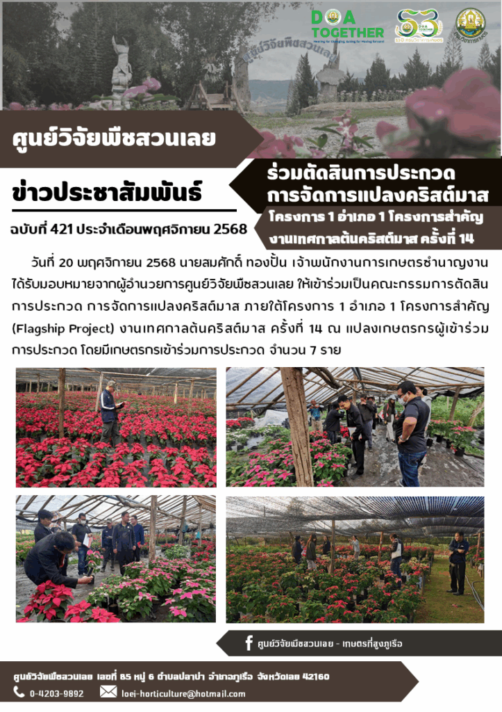 วันที่ 20 พฤศจิกายน 2568 นายสมศักดิ์ ทองปั้น เจ้าพนักงานการเกษตรชำนาญงาน ได้รับมอบหมายจากผู้อำนวยการศูนย์วิจัยพืชสวนเลย ให้เข้าร่วมเป็นคณะกรรมการตัดสินการประกวด การจัดการแปลงคริสต์มาส ภายใต้โครงการ 1 อำเภอ 1 โครงการสำคัญ (Flagship Project) งานเทศกาลต้นคริสต์มาส ครั้งที่ 14 ณ แปลงเกษตรกรผู้เข้าร่วมการประกวด โดยมีเกษตรกรเข้าร่วมการประกวด จำนวน 7 ราย