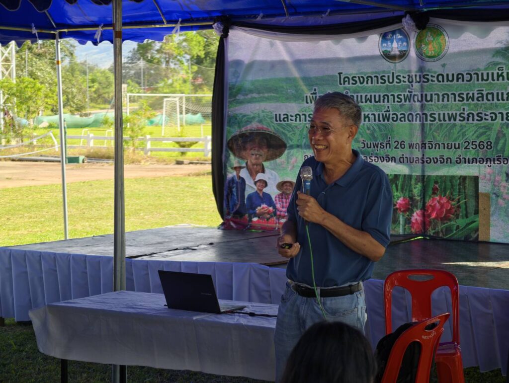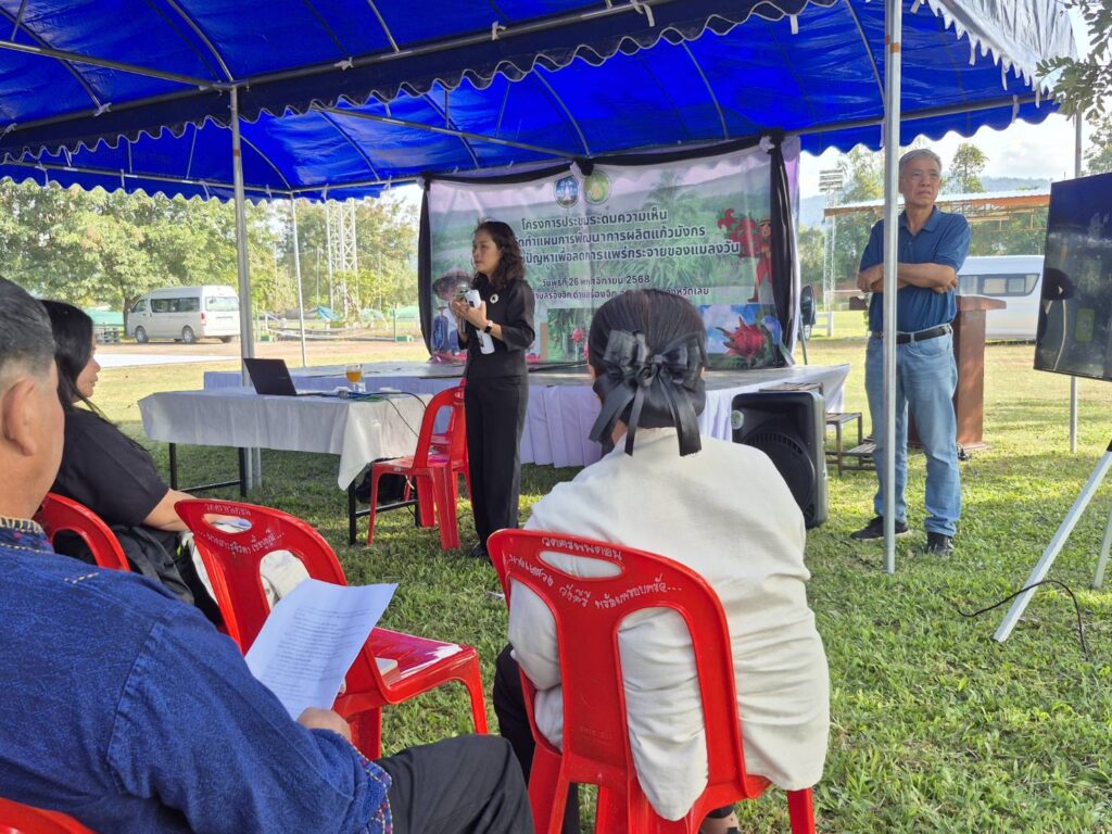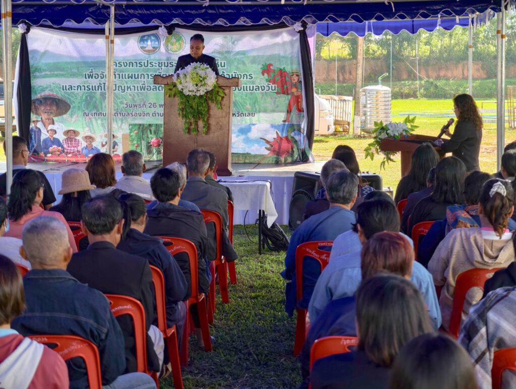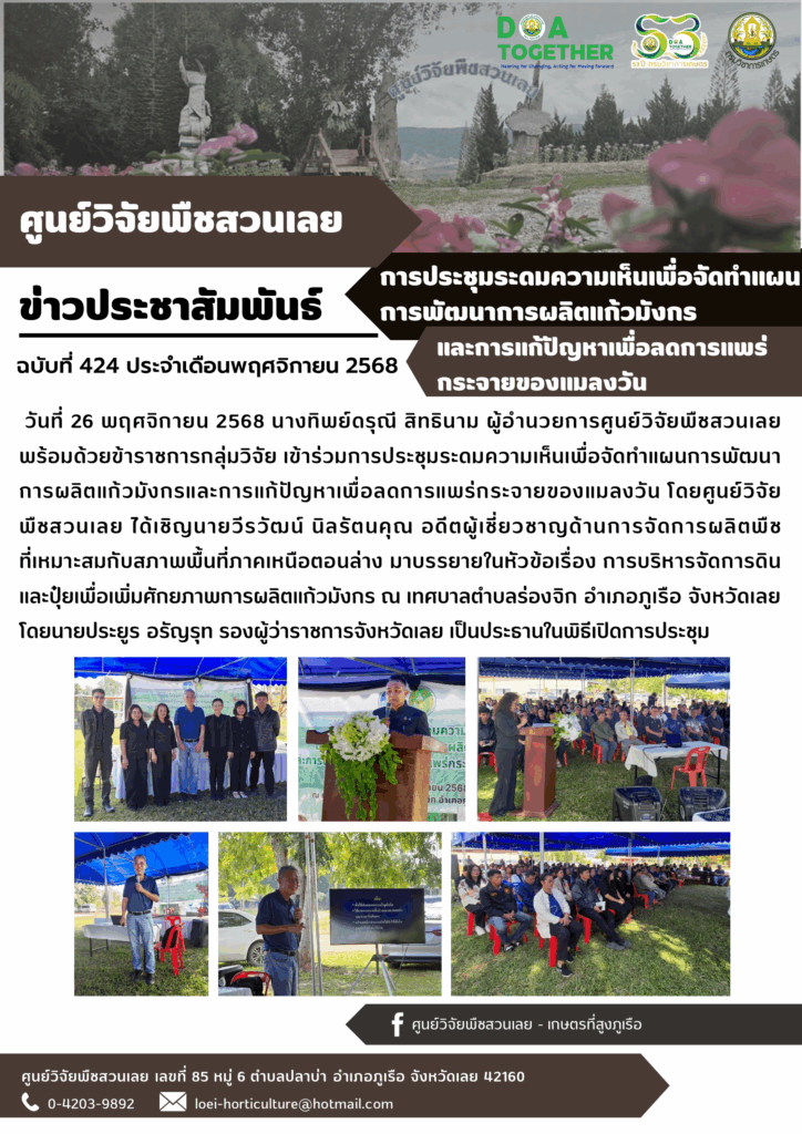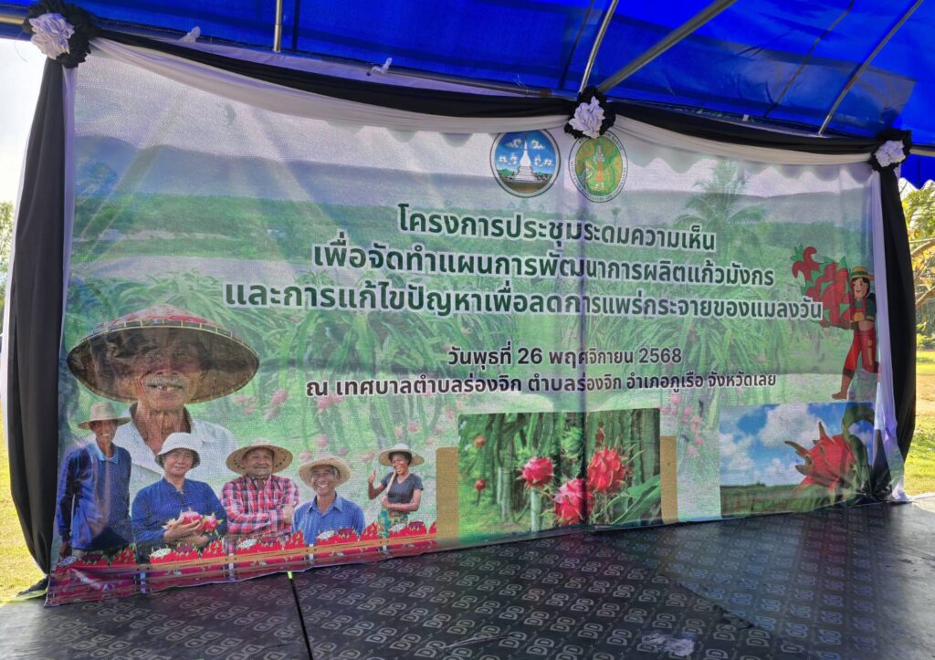 วันที่ 26 พฤศจิกายน 2568 นางทิพย์ดรุณี สิทธินาม ผู้อำนวยการศูนย์วิจัยพืชสวนเลย พร้อมด้วยข้าราชการกลุ่มวิจัย เข้าร่วมการประชุมระดมความเห็นเพื่อจัดทำแผนการพัฒนาการผลิตแก้วมังกรและการแก้ปัญหาเพื่อลดการแพร่กระจายของแมลงวัน โดยศูนย์วิจัยพืชสวนเลย ได้เชิญนายวีรวัฒน์ นิลรัตนคุณ อดีตผู้เชี่ยวชาญด้านการจัดการผลิตพืชที่เหมาะสมกับสภาพพื้นที่ภาคเหนือตอนล่าง มาบรรยายในหัวข้อเรื่อง การบริหารจัดการดินและปุ๋ยเพื่อเพิ่มศักยภาพการผลิตแก้วมังกร ณ เทศบาลตำบลร่องจิก อำเภอภูเรือ จังหวัดเลย โดยนายประยูร อรัญรุท รองผู้ว่าราชการจังหวัดเลย เป็นประธานในพิธีเปิดการประชุม