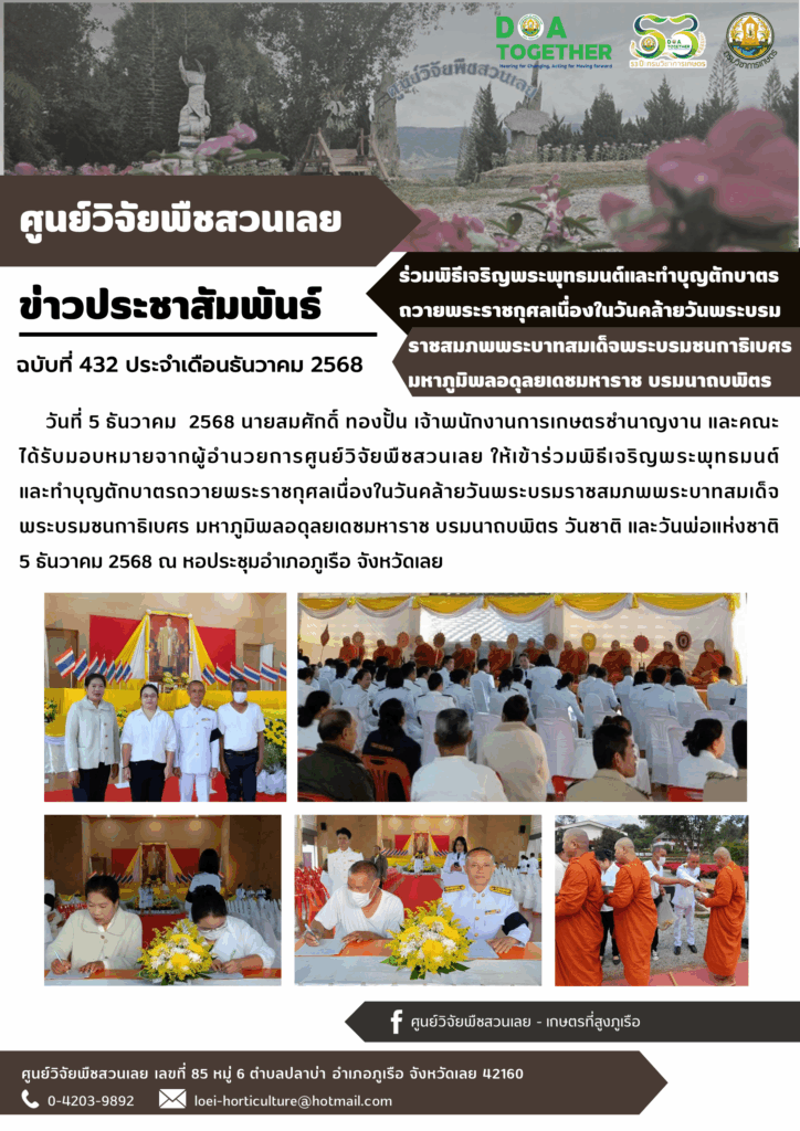 วันที่ 5 ธันวาคม 2568 นายสมศักดิ์ ทองปั้น เจ้าพนักงานการเกษตรชำนาญงาน และคณะ ได้รับมอบหมายจากผู้อำนวยการศูนย์วิจัยพืชสวนเลย ให้เข้าร่วมพิธีเจริญพระพุทธมนต์และทำบุญตักบาตรถวายพระราชกุศลเนื่องในวันคล้ายวันพระบรมราชสมภพพระบาทสมเด็จพระบรมชนกาธิเบศร มหาภูมิพลอดุลยเดชมหาราช บรมนาถบพิตร วันชาติ และวันพ่อแห่งชาติ 5 ธันวาคม 2568 ณ หอประชุมอำเภอภูเรือ จังหวัดเลย