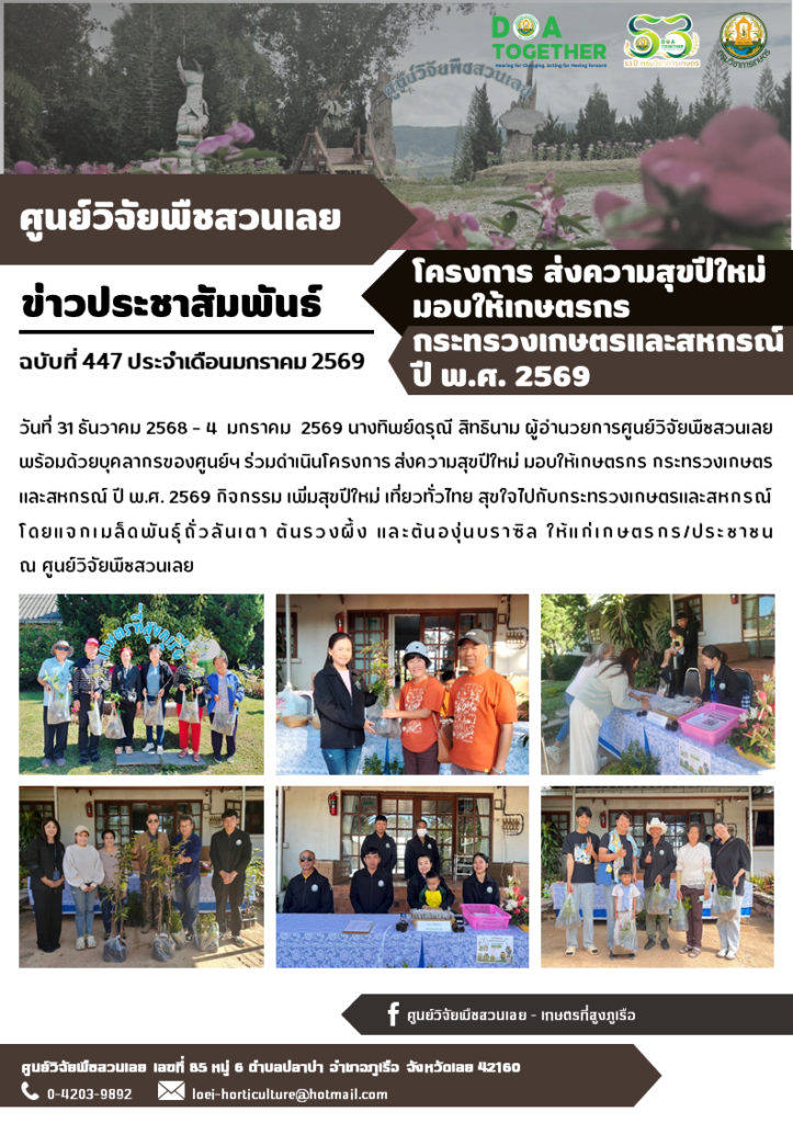 วันที่ 31 ธันวาคม 2568 – 4 มกราคม 2569 นางทิพย์ดรุณี สิทธินาม ผู้อำนวยการศูนย์วิจัยพืชสวนเลย พร้อมด้วยบุคลากรของศูนย์ฯ ร่วมดำเนินโครงการ ส่งความสุขปีใหม่ มอบให้เกษตรกร กระทรวงเกษตรและสหกรณ์ ปี พ.ศ. 2569 กิจกรรม เพิ่มสุขปีใหม่ เที่ยวทั่วไทย สุขใจไปกับกระทรวงเกษตรและสหกรณ์ โดยแจกเมล็ดพันธุ์ถั่วลันเตา ต้นรวงผึ้ง และต้นองุ่นบราซิล ให้แก่เกษตรกร/ประชาชน ณ ศูนย์วิจัยพืชสวนเลย
