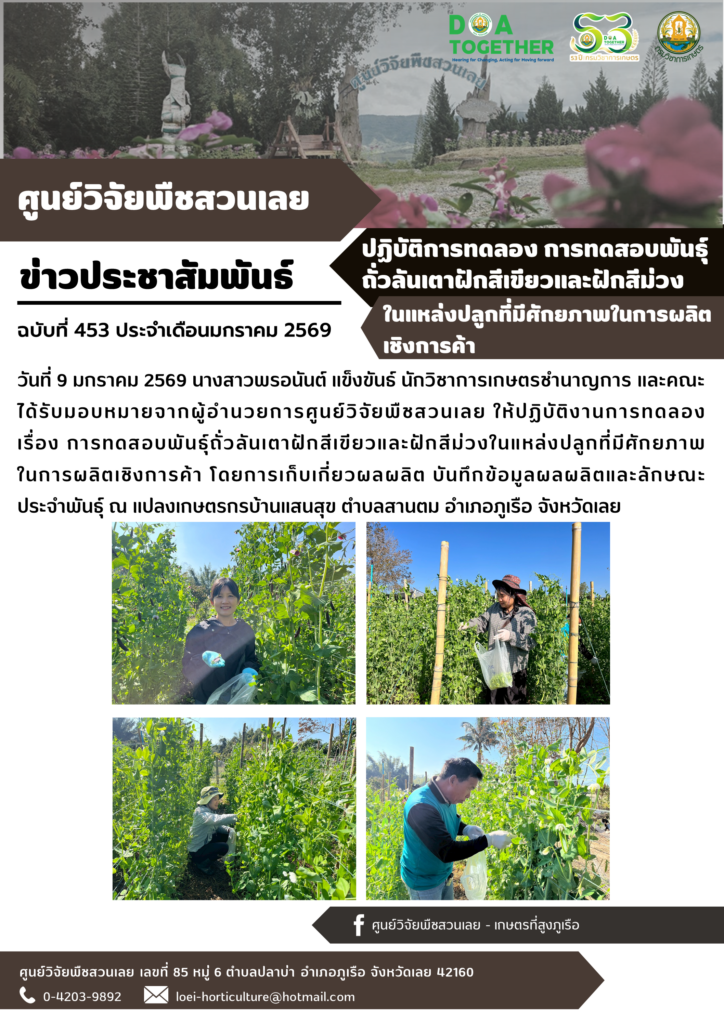 วันที่ 9 มกราคม 2569 นางสาวพรอนันต์ แข็งขันธ์ นักวิชาการเกษตรชำนาญการ และคณะ ได้รับมอบหมายจากผู้อำนวยการศูนย์วิจัยพืชสวนเลย ให้ปฏิบัติงานการทดลอง เรื่อง การทดสอบพันธุ์ถั่วลันเตาฝักสีเขียวและฝักสีม่วงในแหล่งปลูกที่มีศักยภาพในการผลิตเชิงการค้า โดยการเก็บเกี่ยวผลผลิต บันทึกข้อมูลผลผลิตและลักษณะประจำพันธุ์ ณ แปลงเกษตรกรบ้านแสนสุข ตำบลสานตม อำเภอภูเรือ จังหวัดเลย