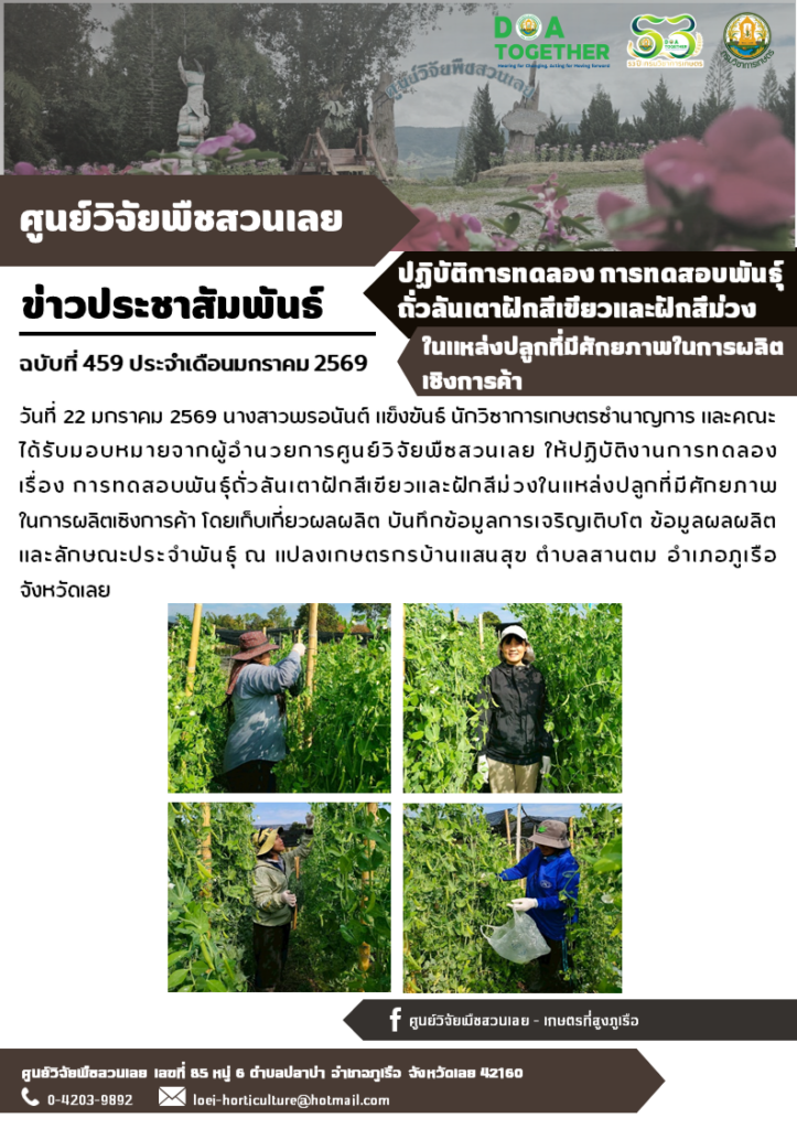 วันที่ 22 มกราคม 2569 นางสาวพรอนันต์ แข็งขันธ์ นักวิชาการเกษตรชำนาญการ และคณะ ได้รับมอบหมายจากผู้อำนวยการศูนย์วิจัยพืชสวนเลย ให้ปฏิบัติงานการทดลอง เรื่อง การทดสอบพันธุ์ถั่วลันเตาฝักสีเขียวและฝักสีม่วงในแหล่งปลูกที่มีศักยภาพในการผลิตเชิงการค้า โดยเก็บเกี่ยวผลผลิต บันทึกข้อมูลการเจริญเติบโต ข้อมูลผลผลิต และลักษณะประจำพันธุ์ ณ แปลงเกษตรกรบ้านแสนสุข ตำบลสานตม อำเภอภูเรือ จังหวัดเลย