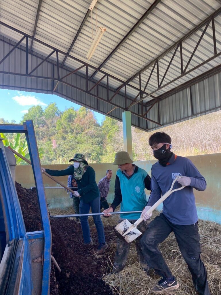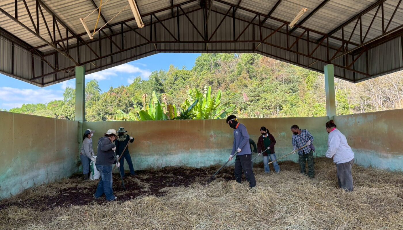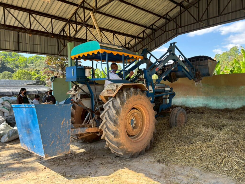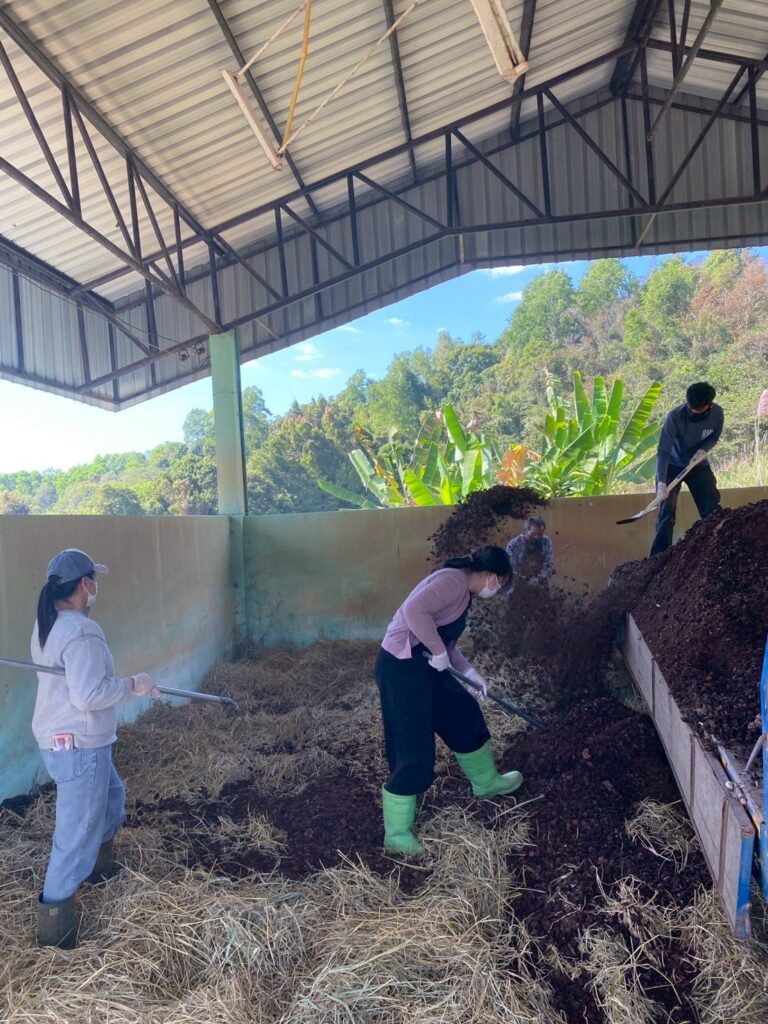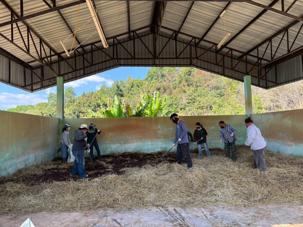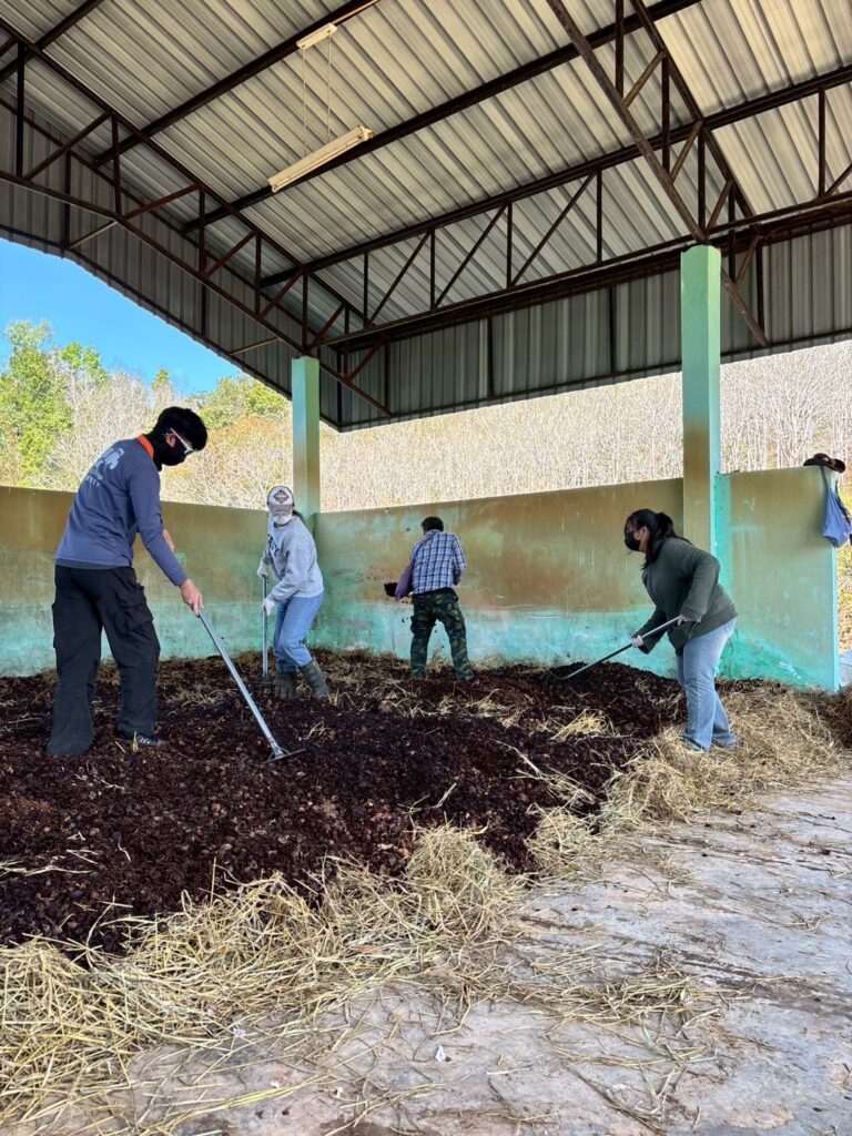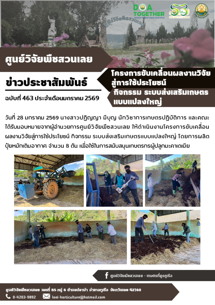 วันที่ 28 มกราคม 2569 นางสาวปฏิญญา มีบุญ นักวิชาการเกษตรปฏิบัติการ และคณะ ได้รับมอบหมายจากผู้อำนวยการศูนย์วิจัยพืชสวนเลย ให้ดำเนินงานโครงการขับเคลื่อนผลงานวิจัยสู่การใช้ประโยชน์ กิจกรรม ระบบส่งเสริมเกษตรแบบแปลงใหญ่ โดยการผลิตปุ๋ยหมักเติมอากาศ จำนวน 8 ตัน เพื่อใช้ในการสนับสนุนเกษตรกรผู้ปลูกมะคาเดเมีย