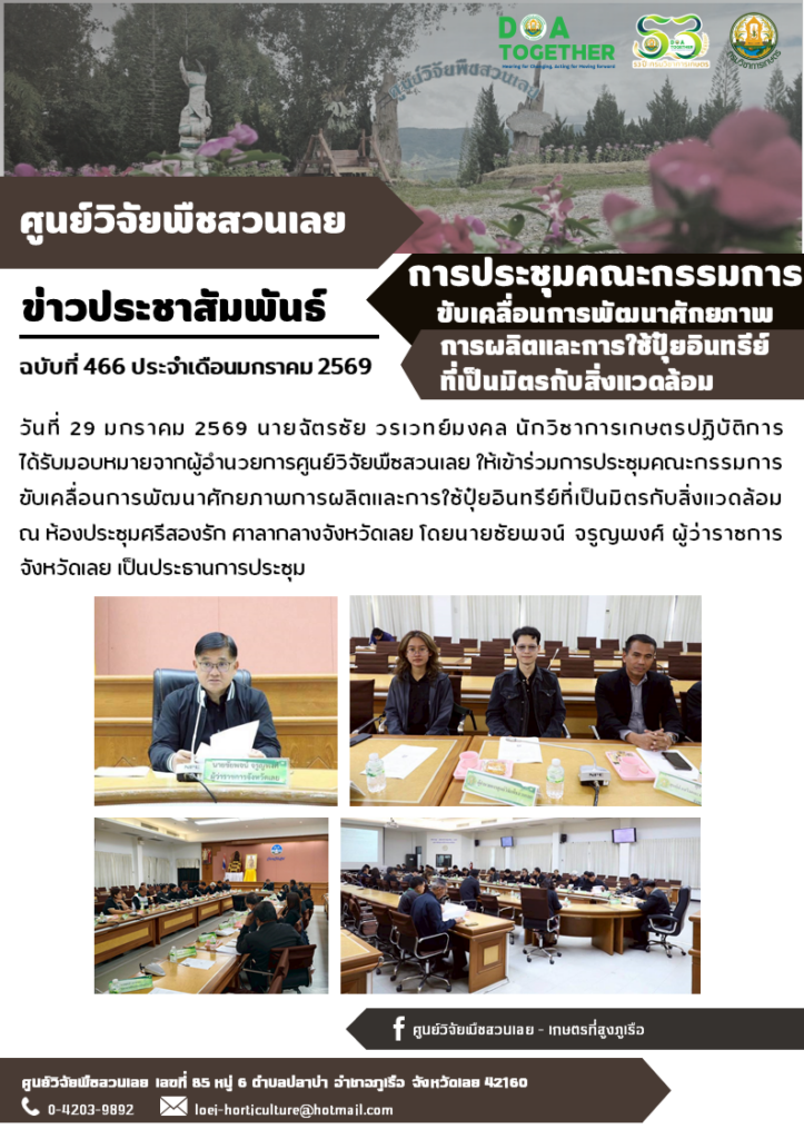 วันที่ 29 มกราคม 2569 นายฉัตรชัย วรเวทย์มงคล นักวิชาการเกษตรปฏิบัติการ ได้รับมอบหมายจากผู้อำนวยการศูนย์วิจัยพืชสวนเลย ให้เข้าร่วมการประชุมคณะกรรมการขับเคลื่อนการพัฒนาศักยภาพการผลิตและการใช้ปุ๋ยอินทรีย์ที่เป็นมิตรกับสิ่งแวดล้อม ณ ห้องประชุมศรีสองรัก ศาลากลางจังหวัดเลย โดยนายชัยพจน์ จรูญพงศ์ ผู้ว่าราชการจังหวัดเลย เป็นประธานการประชุม