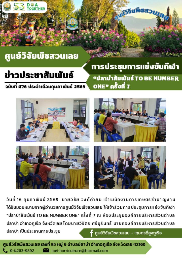 วันที่ 16 กุมภาพันธ์ 2569 นายวิชัย วงค์คำสม เจ้าพนักงานการเกษตรชำนาญงาน ได้รับมอบหมายจากผู้อำนวยการศูนย์วิจัยพืชสวนเลย ให้เข้าร่วมการประชุมการแข่งขันกีฬา “ปลาบ่าสัมพันธ์ TO BE NUMBER ONE” ครั้งที่ 7 ณ ห้องประชุมองค์การบริหารส่วนตำบลปลาบ่า อำเภอภูเรือ จังหวัดเลย โดยนายวิรัตร ศรีบุรินทร์ นายกองค์การบริหารส่วนตำบลปลาบ่า เป็นประธานการประชุม